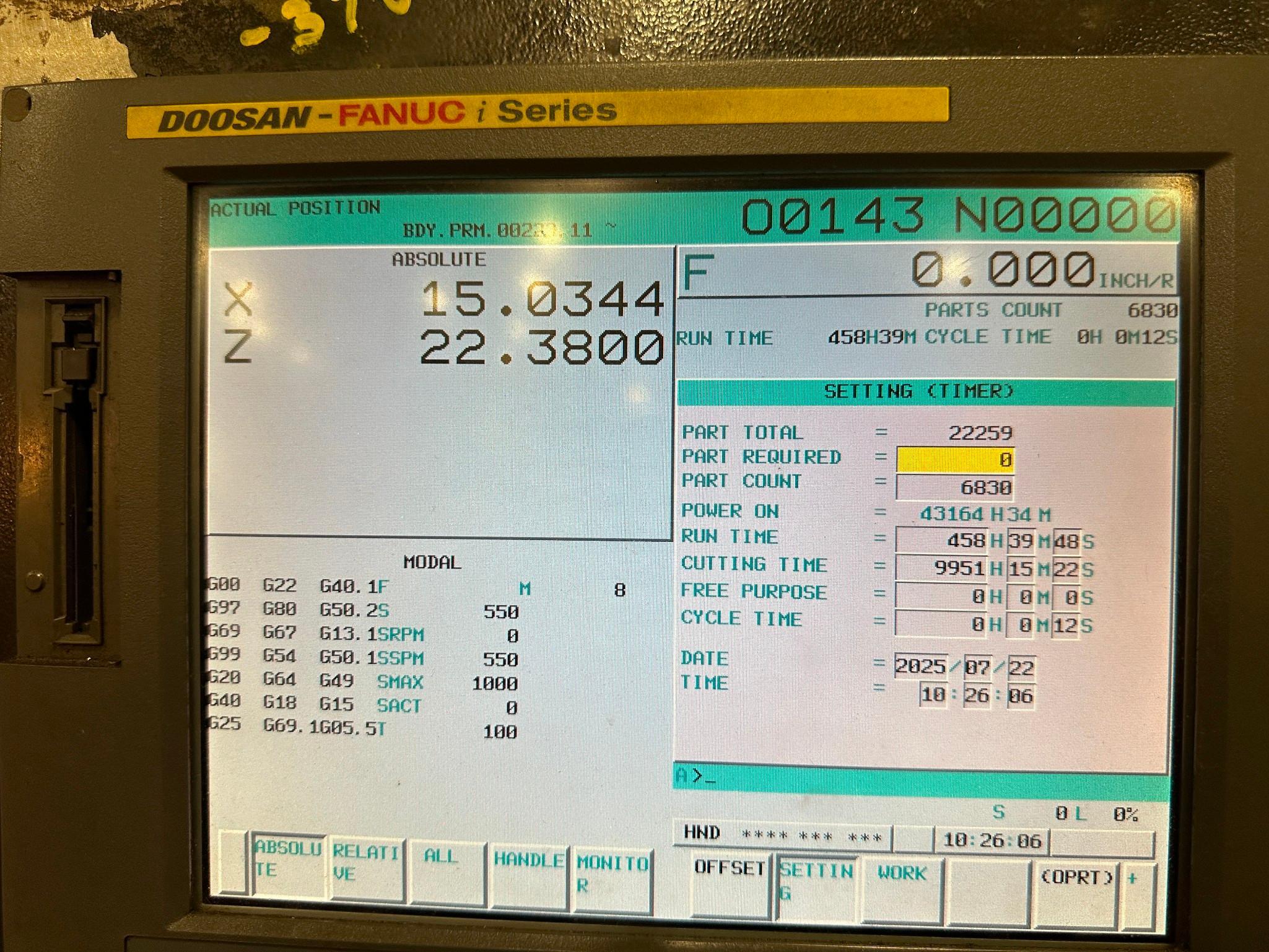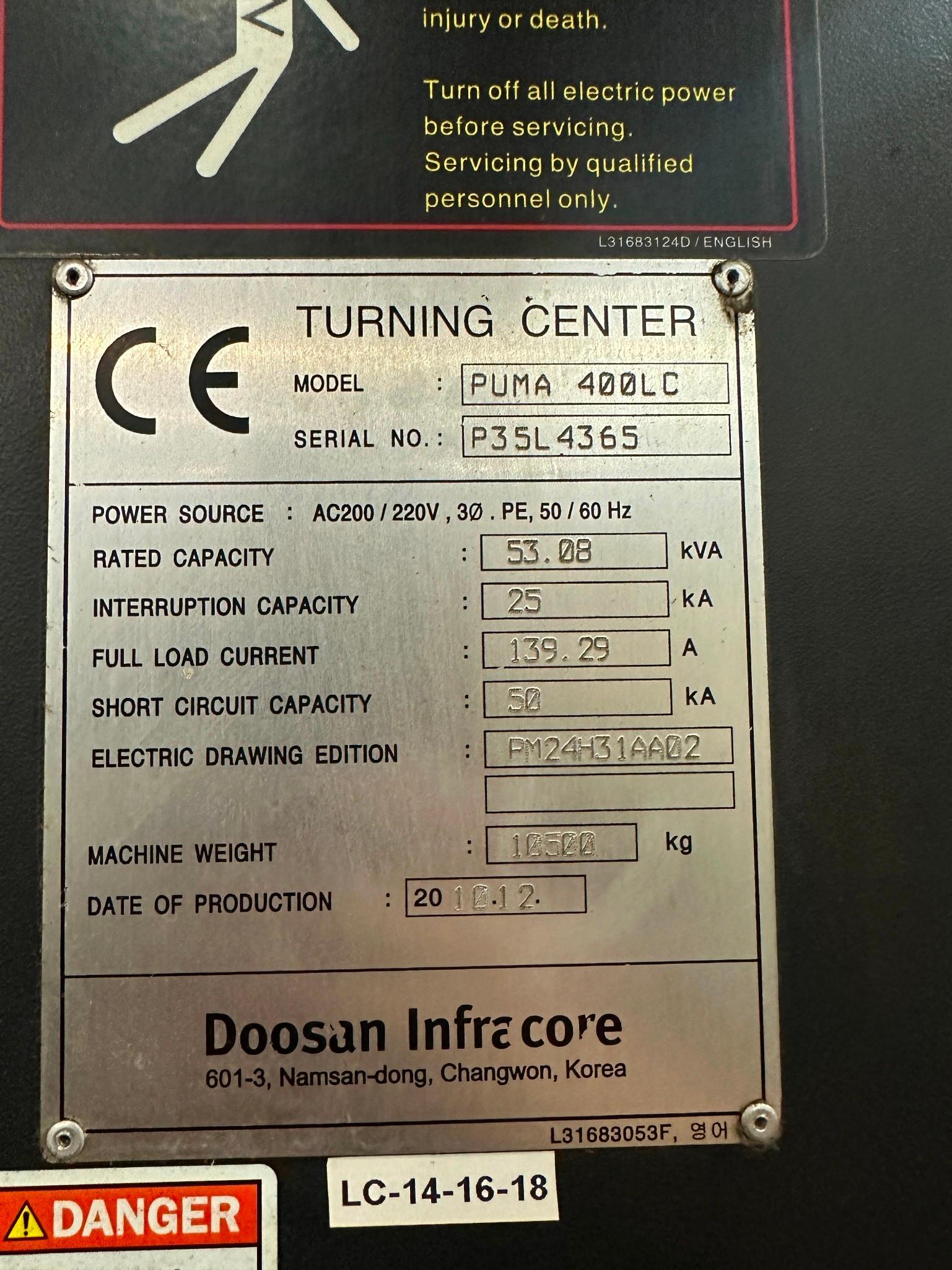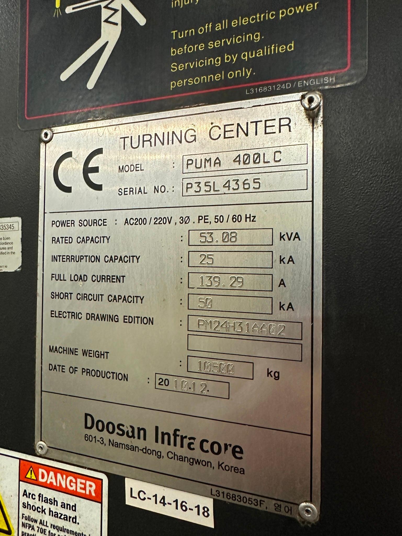 2010 DOOSAN PUMA 400LC CNC LATHE, 21″ CHUCK, LOW HOURS, TURNING CENTER, 6.5″ SPINDLE BORE SN: P35L43