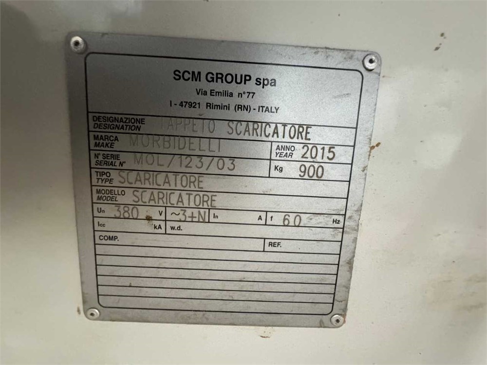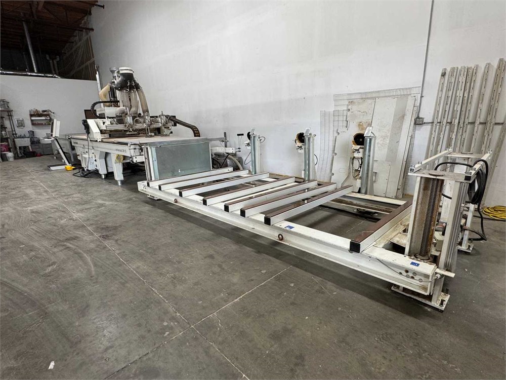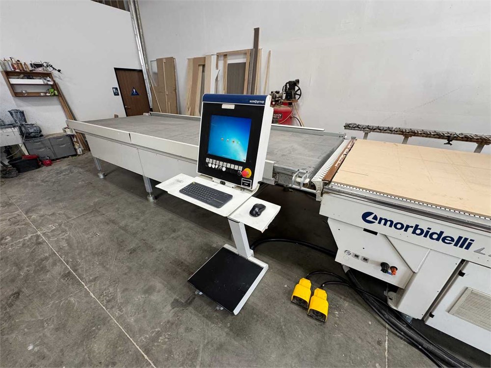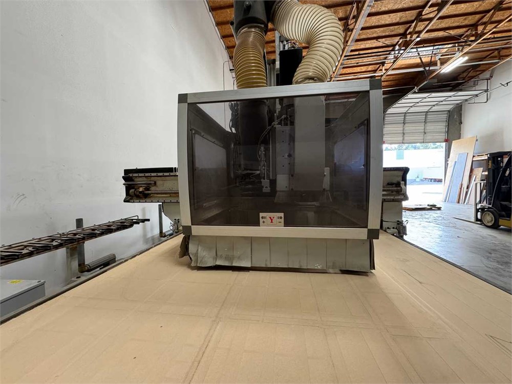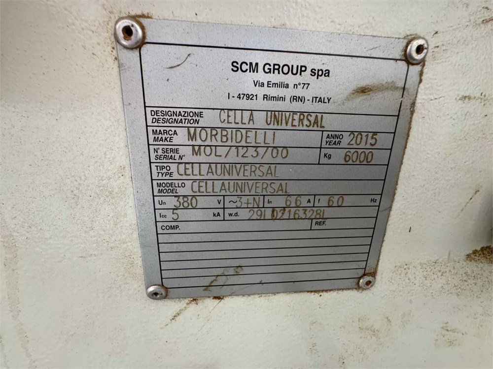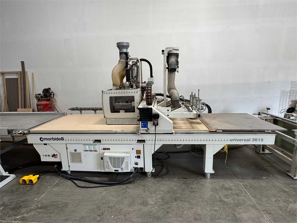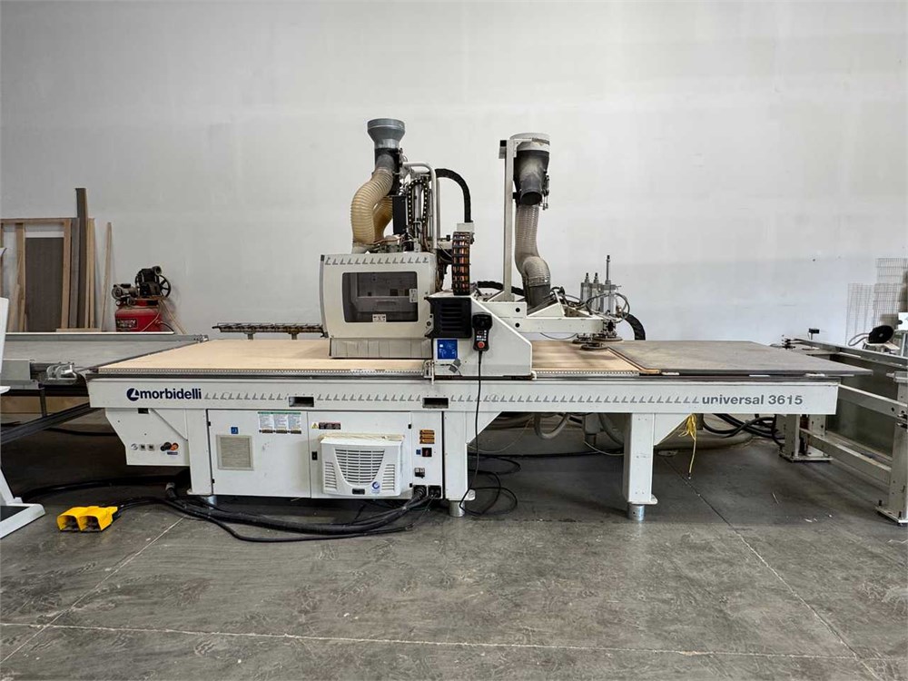 2015 Morbidelli “Universal 3615″ CNC Router Cell See photo of machine layout in pictures Infeed 180″ L x 108″ W x 48″ H (overall size as setup for production) Scissor lift table Machine 200″ L x 108″ W x 110″ H (overall size as setup for production) 60″ x 144″ router table Aluminum Eight (8) vacuum zones Pneumatic reference stops Gridded for custom gasketing Drill unit Eighteen (18) vertical spindles 3 HP motor 1,000 – 6,000 RPM Router HSK 12 HP 1,000 – 24,000 RPM Air blowoff nozzle Tool changer Twenty (20) positions Mounted on rear of machine Sound enclosure Panel loading and offloading devices Foot pedal operation Air-conditioned electrical cabinet Outfeed 190″ L x 72″ W x 68” H (overall size as setup for production) Motorized belt conveyor Top and bottom dust collection Safety fencing Front safety photo eyes PC control on mobile stand Windows operating system XILOG Plus operating software Standard keyboard and mouse Manuals downloaded on PC PC password “morbi” Remote control pendant External electrical transformer Vacuum pumps NOT included, offered in lots 002 and 003 Dust pipe and flex hose NOT included