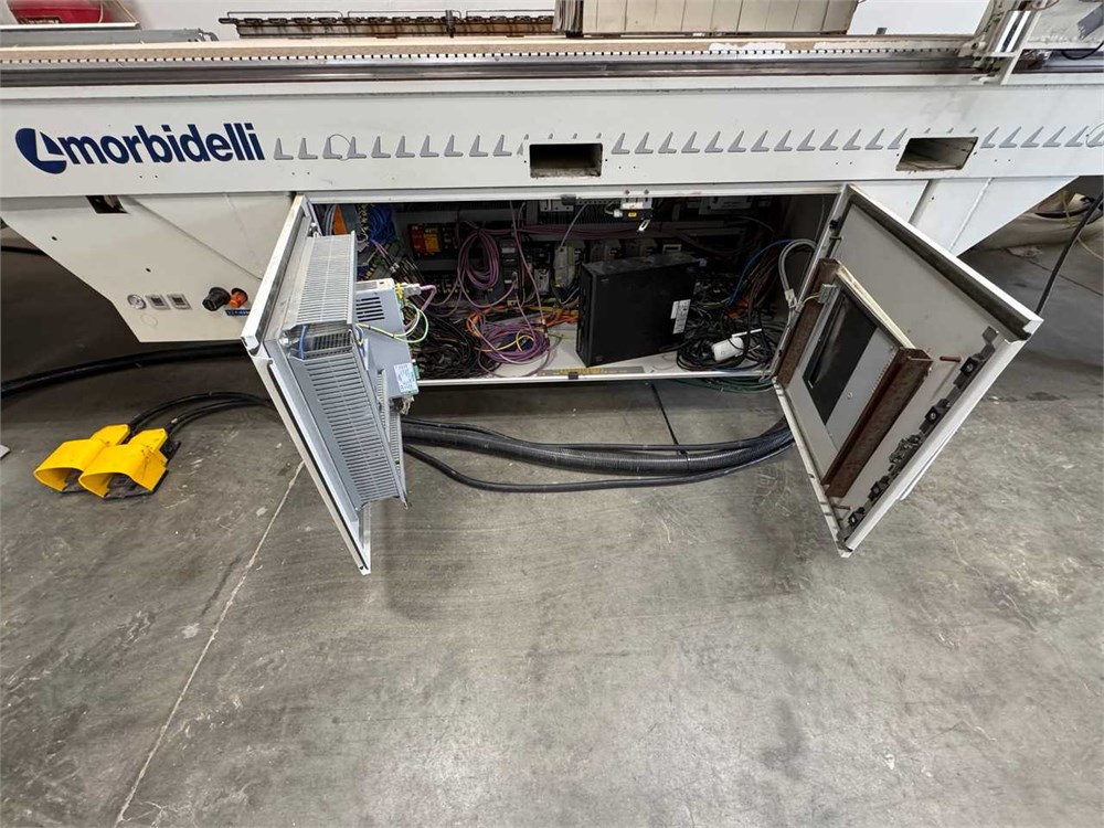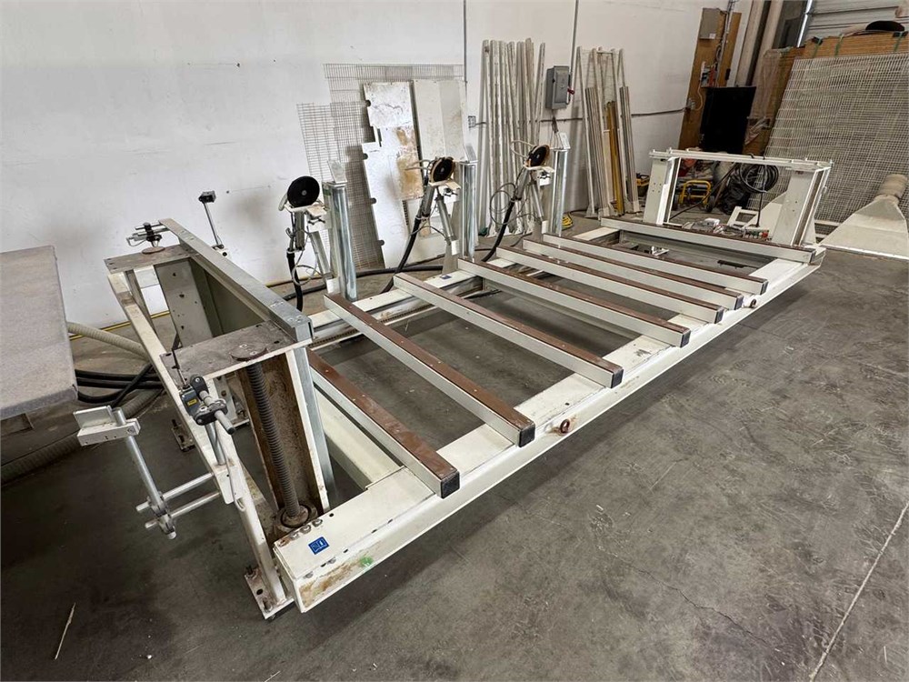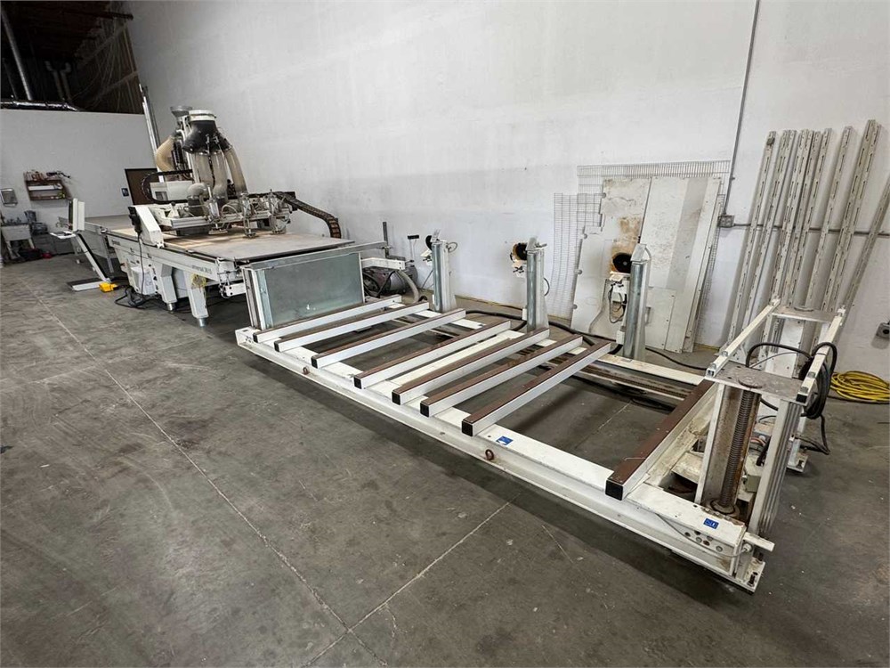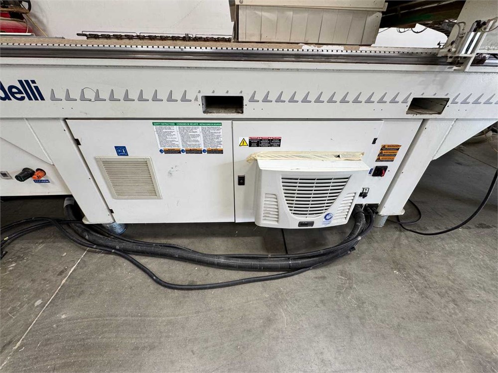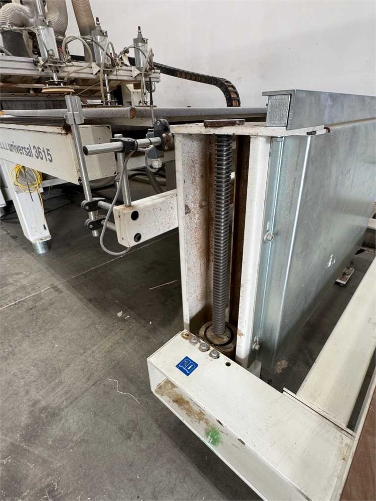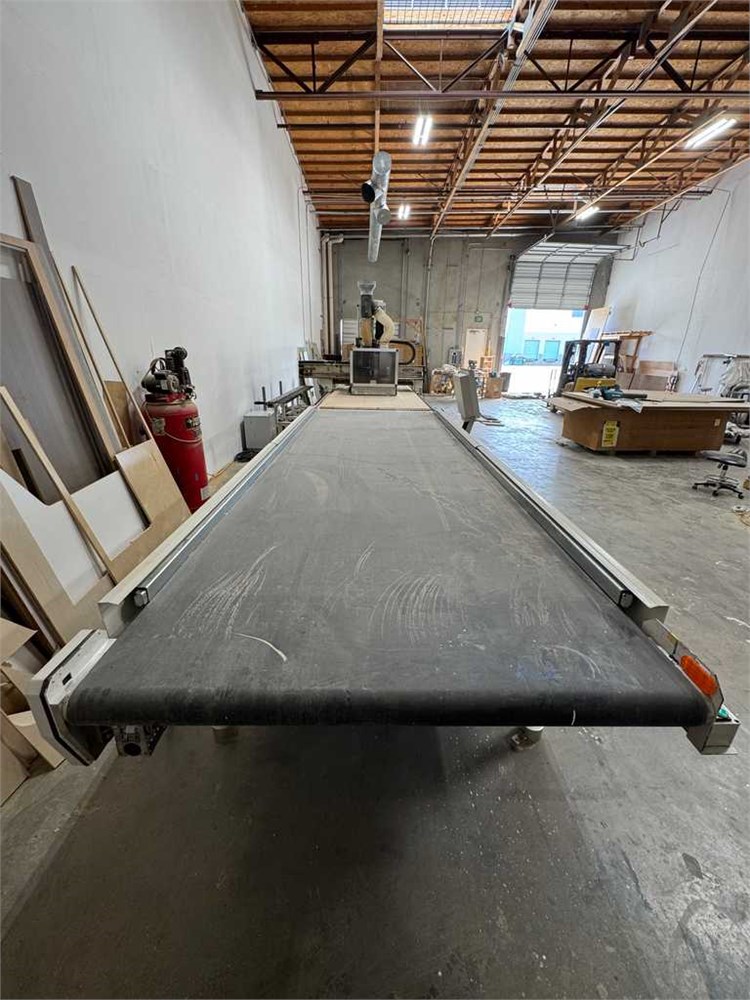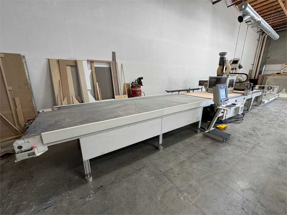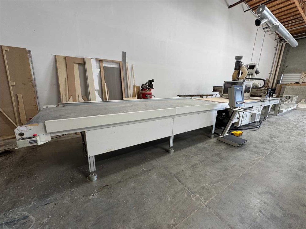 2015 Morbidelli “Universal 3615″ CNC Router Cell See photo of machine layout in pictures Infeed 180″ L x 108″ W x 48″ H (overall size as setup for production) Scissor lift table Machine 200″ L x 108″ W x 110″ H (overall size as setup for production) 60″ x 144″ router table Aluminum Eight (8) vacuum zones Pneumatic reference stops Gridded for custom gasketing Drill unit Eighteen (18) vertical spindles 3 HP motor 1,000 – 6,000 RPM Router HSK 12 HP 1,000 – 24,000 RPM Air blowoff nozzle Tool changer Twenty (20) positions Mounted on rear of machine Sound enclosure Panel loading and offloading devices Foot pedal operation Air-conditioned electrical cabinet Outfeed 190″ L x 72″ W x 68” H (overall size as setup for production) Motorized belt conveyor Top and bottom dust collection Safety fencing Front safety photo eyes PC control on mobile stand Windows operating system XILOG Plus operating software Standard keyboard and mouse Manuals downloaded on PC PC password “morbi” Remote control pendant External electrical transformer Vacuum pumps NOT included, offered in lots 002 and 003 Dust pipe and flex hose NOT included