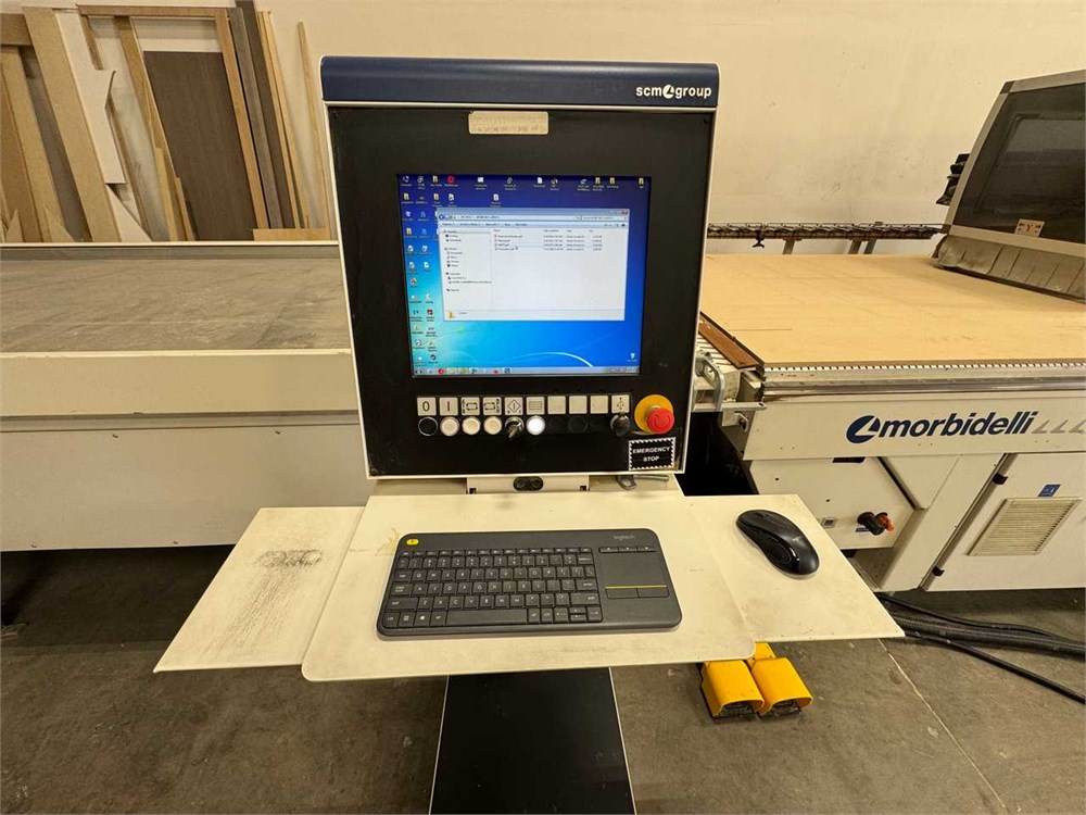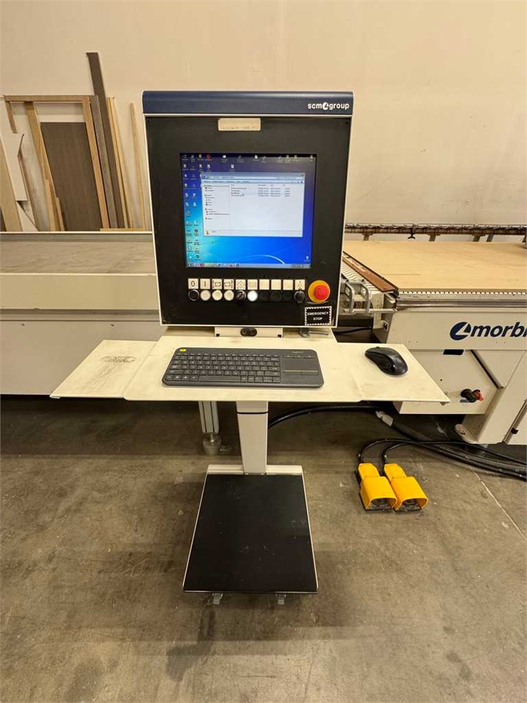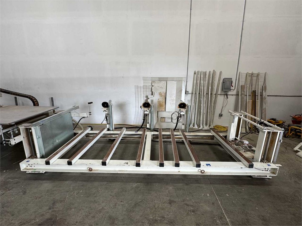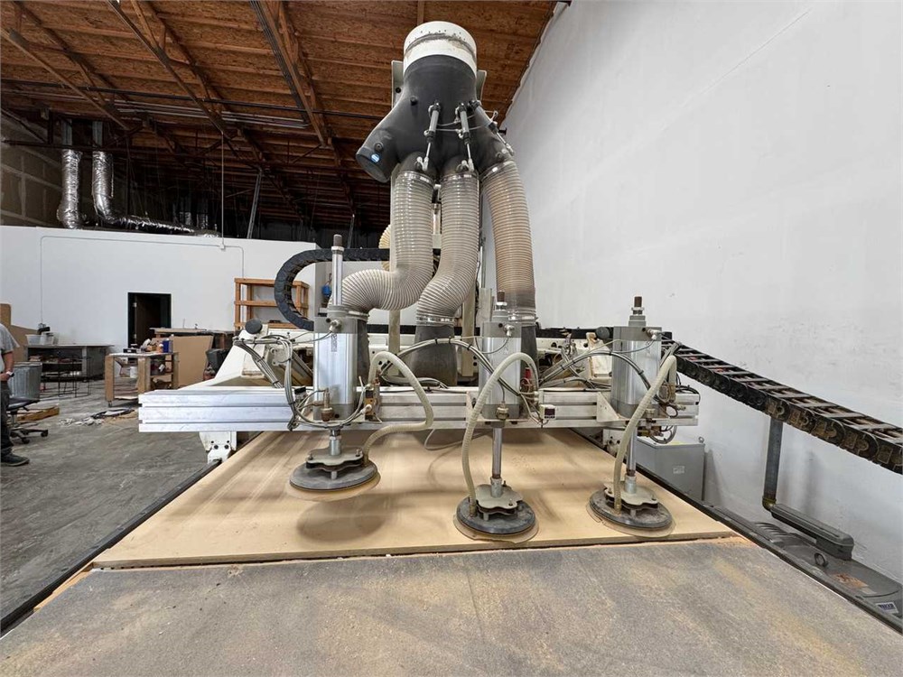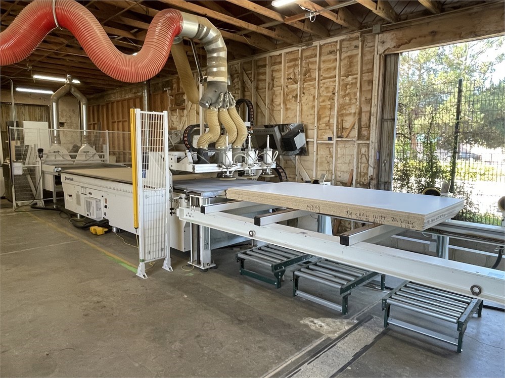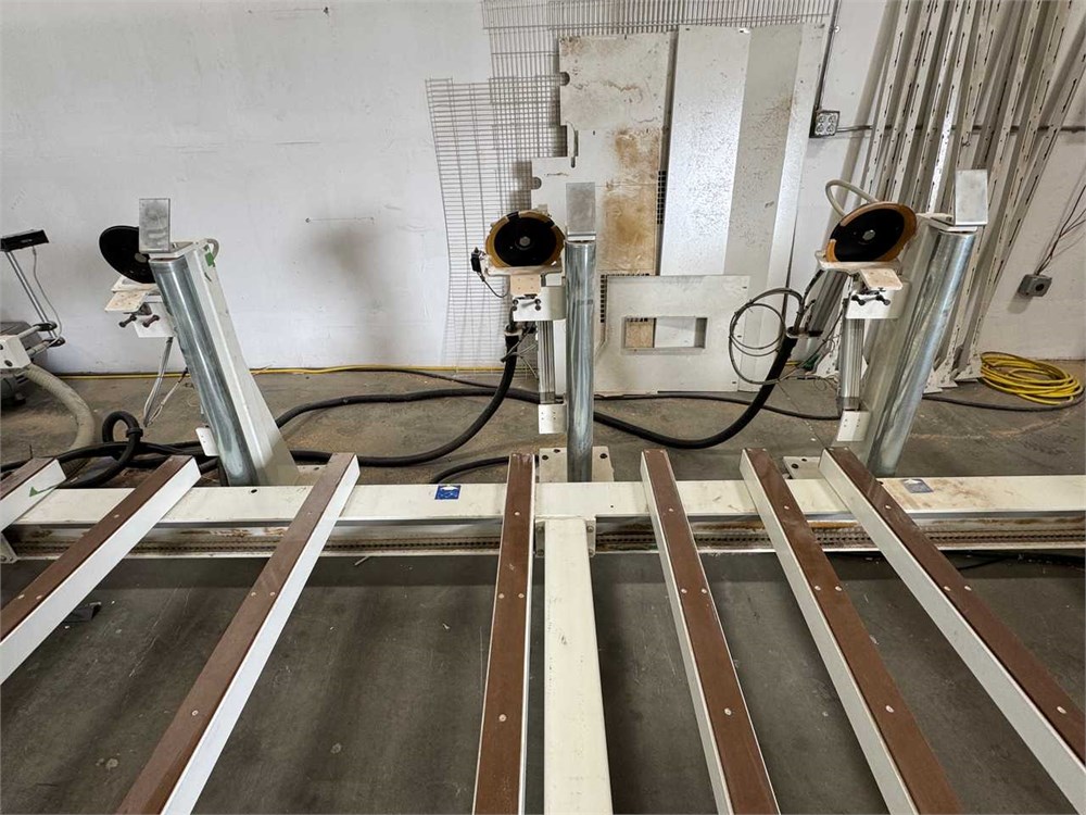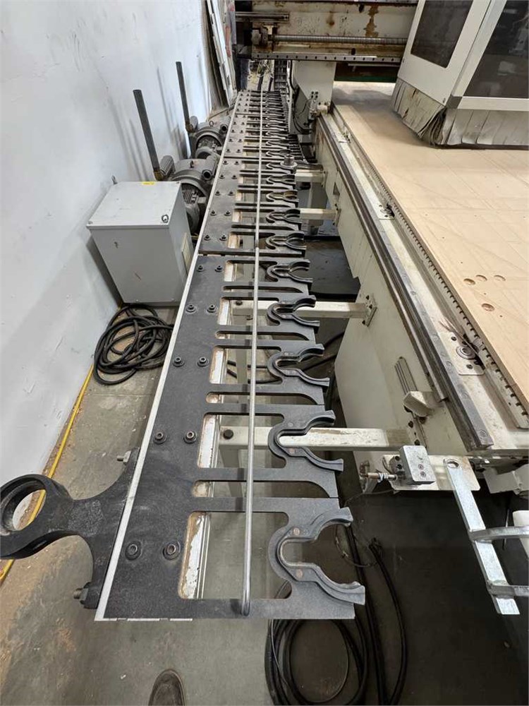 2015 Morbidelli “Universal 3615″ CNC Router Cell See photo of machine layout in pictures Infeed 180″ L x 108″ W x 48″ H (overall size as setup for production) Scissor lift table Machine 200″ L x 108″ W x 110″ H (overall size as setup for production) 60″ x 144″ router table Aluminum Eight (8) vacuum zones Pneumatic reference stops Gridded for custom gasketing Drill unit Eighteen (18) vertical spindles 3 HP motor 1,000 – 6,000 RPM Router HSK 12 HP 1,000 – 24,000 RPM Air blowoff nozzle Tool changer Twenty (20) positions Mounted on rear of machine Sound enclosure Panel loading and offloading devices Foot pedal operation Air-conditioned electrical cabinet Outfeed 190″ L x 72″ W x 68” H (overall size as setup for production) Motorized belt conveyor Top and bottom dust collection Safety fencing Front safety photo eyes PC control on mobile stand Windows operating system XILOG Plus operating software Standard keyboard and mouse Manuals downloaded on PC PC password “morbi” Remote control pendant External electrical transformer Vacuum pumps NOT included, offered in lots 002 and 003 Dust pipe and flex hose NOT included