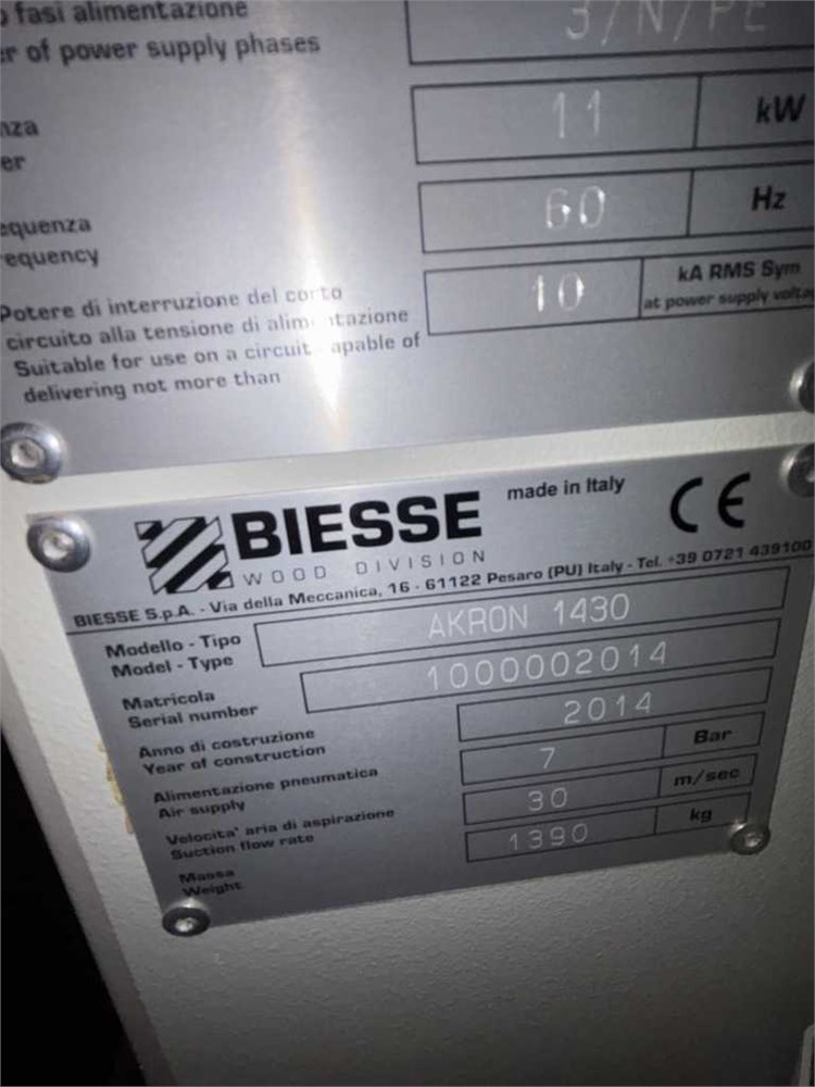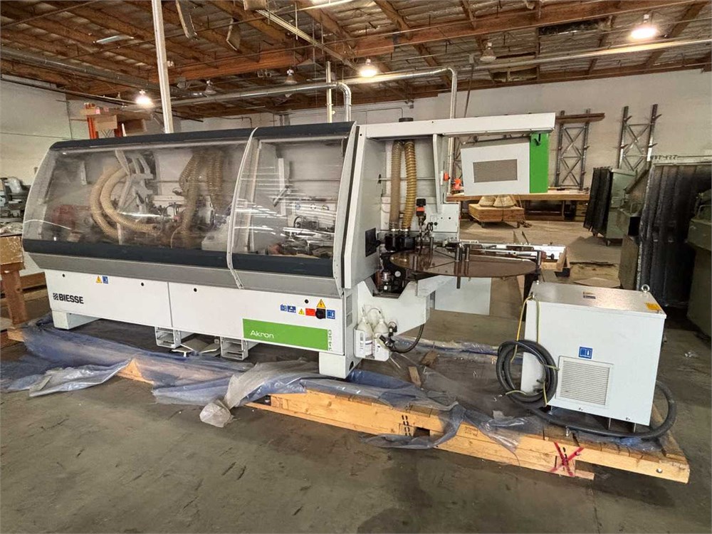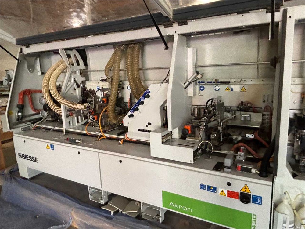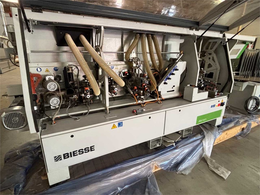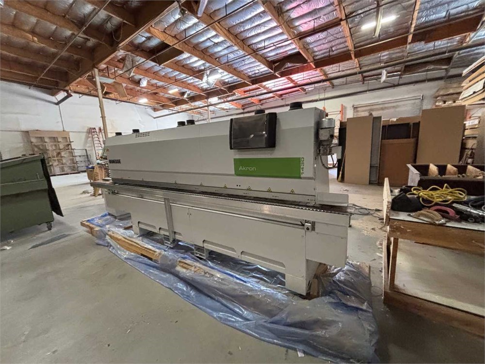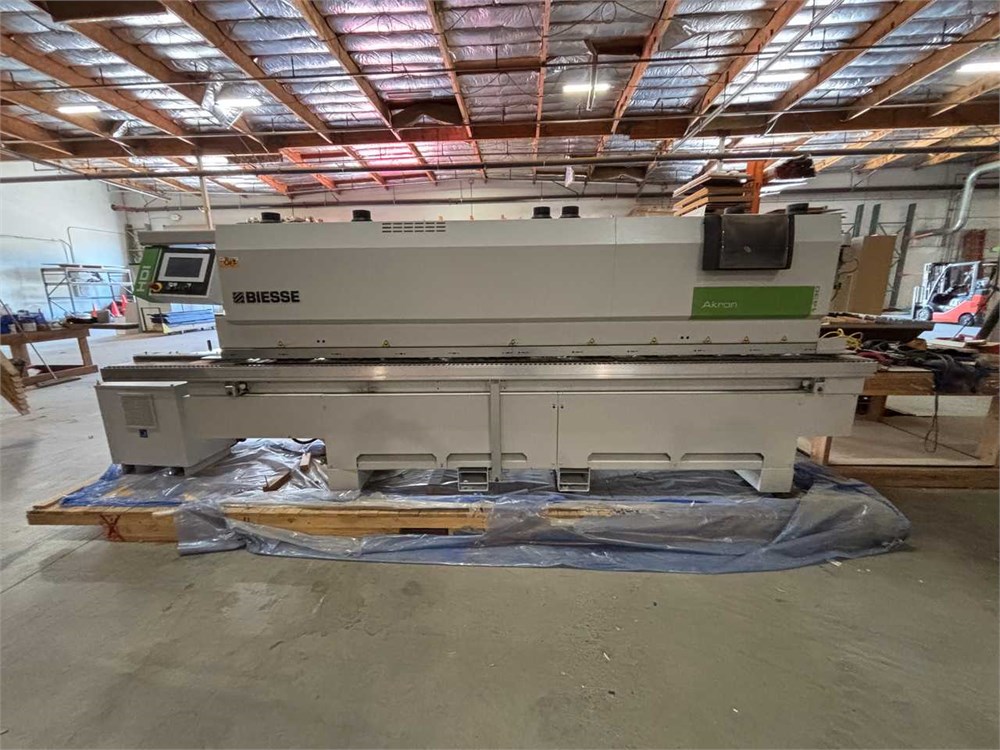 Biesse “Akron 1430″ Edgebander This machine has not been setup/run in production since purchase Min. panel height: 10 mm, Max. panel height: 60 mm, Height of edgebanding material: 14-64 mm, Thickness of edgebanding material in rolls: 0.4-3 mm, Thickness of edgebanding in strips: 0.4-12 mm, Min. panel protrusion from the track: 25 mm, Panel length: 140 – 3200 mm, Min. panel width (with length 140 mm): 85 mm, Min. panel width (with length 250 mm): 50 mm. 39 – 59 FPM feed speed Motorized top beam positioning Touch screen controller Edgebanding infeed table Guillotine Infeed fence Anti-adhesive spray unit Two (2) motor pre-milling unit Quick-change glue pot with application roller Pressure unit with one (1) driven roller and two (2) idle rollers Two (2) motor end trimming unit Top/bottom fine trimming unit Top/bottom profile scraping unit with external collection box Top/bottom flat scraping unit Top/buffing unit Hot air unit Lighted sound enclosure Outboard roller support External electrical transformer