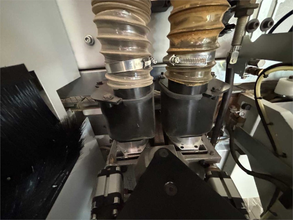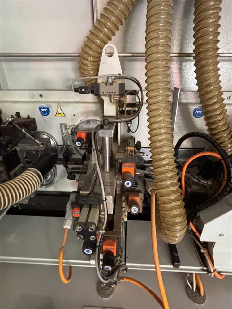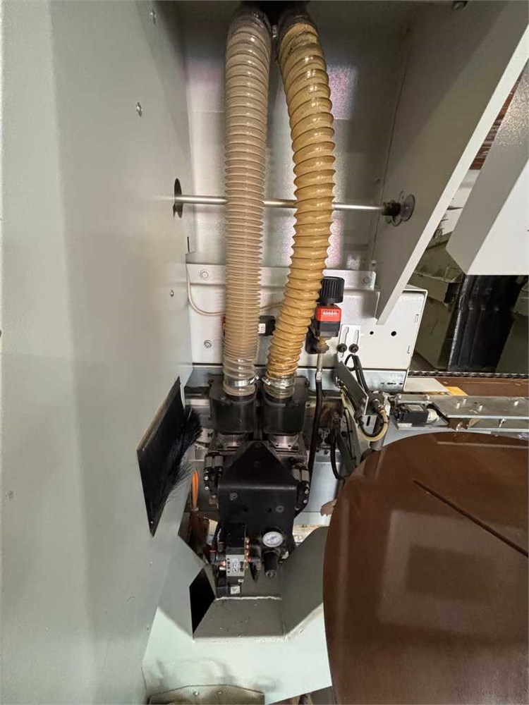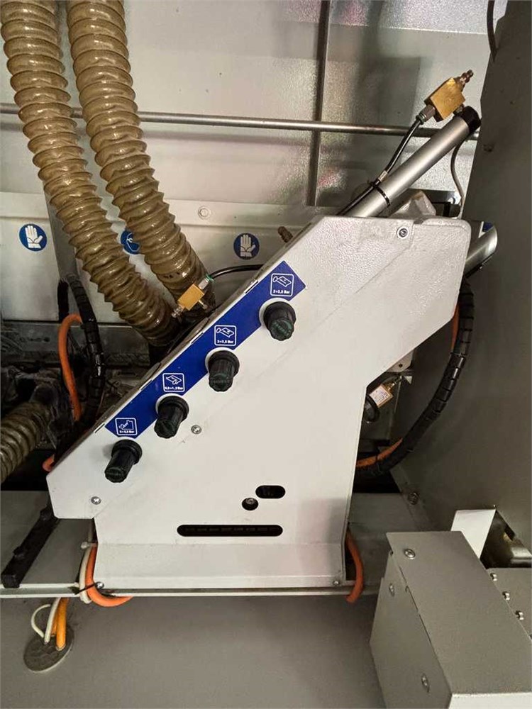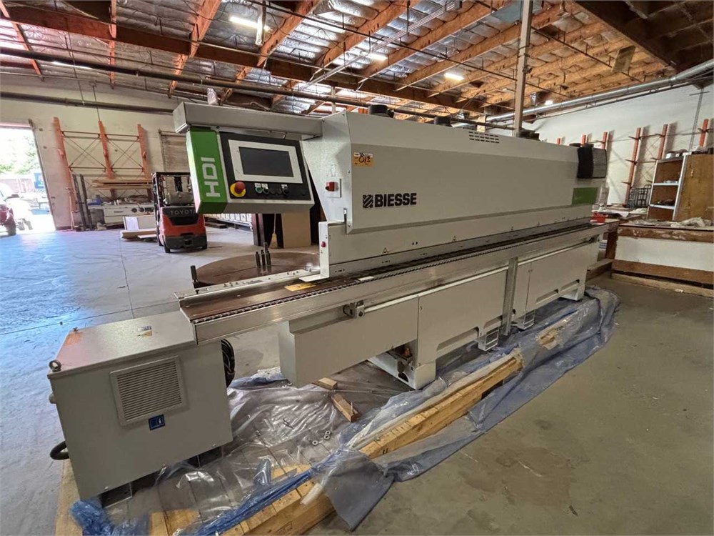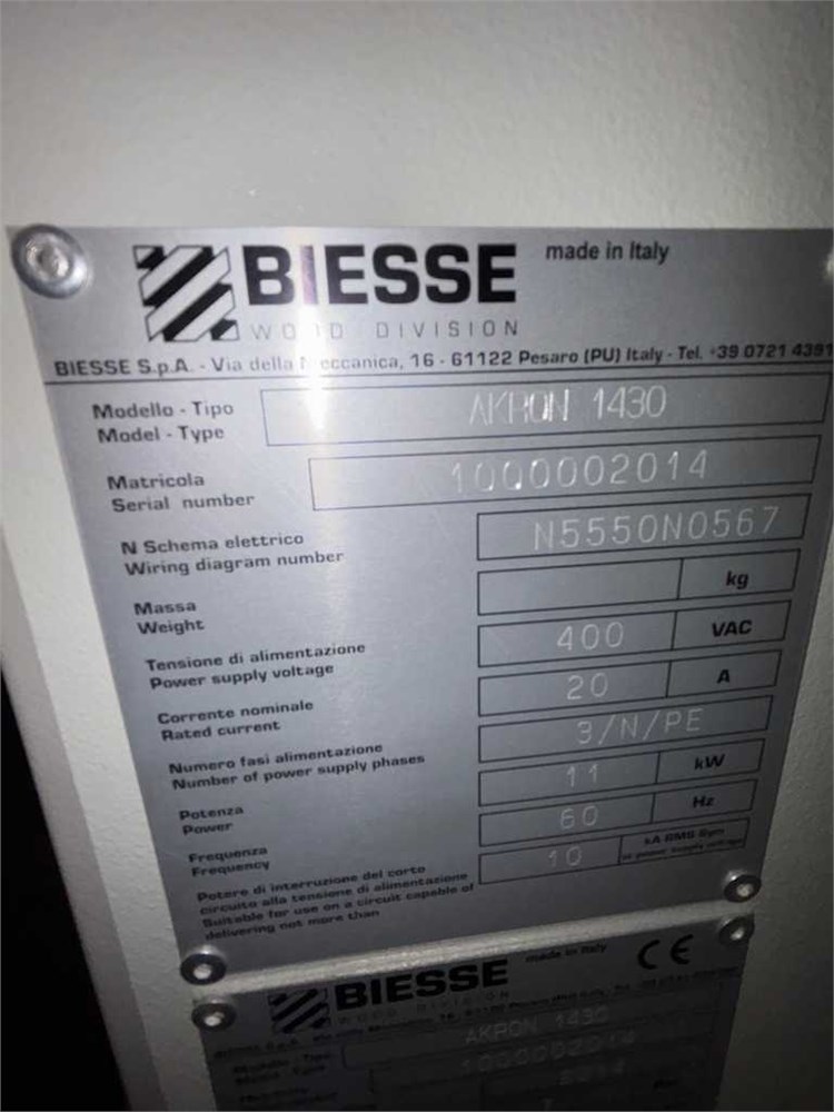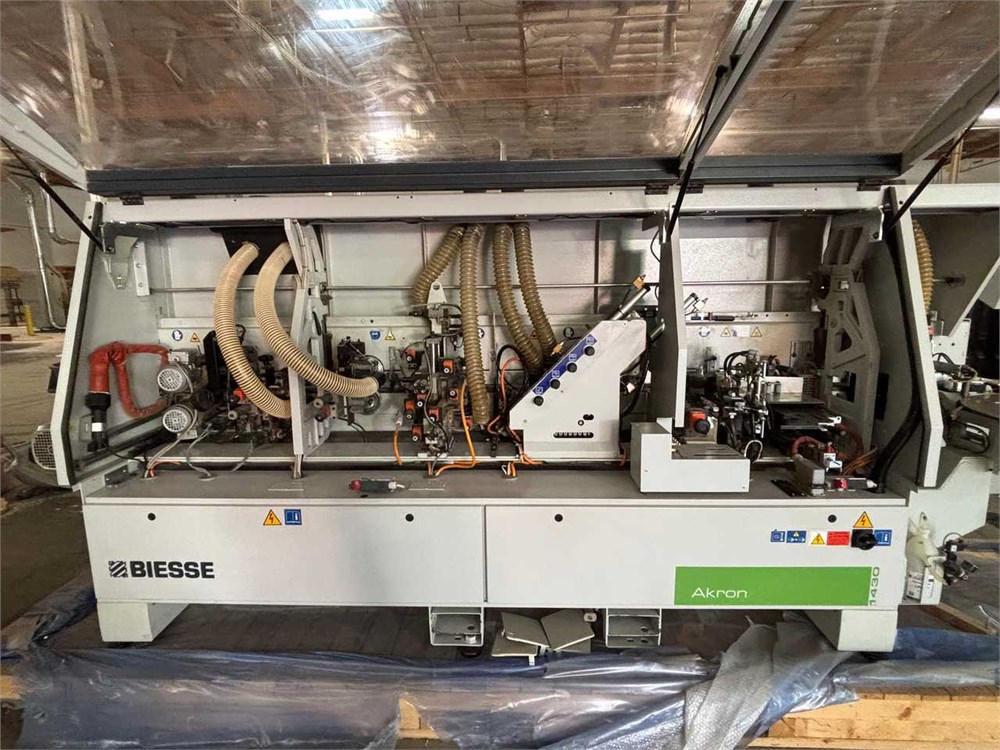 Biesse “Akron 1430″ Edgebander This machine has not been setup/run in production since purchase Min. panel height: 10 mm, Max. panel height: 60 mm, Height of edgebanding material: 14-64 mm, Thickness of edgebanding material in rolls: 0.4-3 mm, Thickness of edgebanding in strips: 0.4-12 mm, Min. panel protrusion from the track: 25 mm, Panel length: 140 – 3200 mm, Min. panel width (with length 140 mm): 85 mm, Min. panel width (with length 250 mm): 50 mm. 39 – 59 FPM feed speed Motorized top beam positioning Touch screen controller Edgebanding infeed table Guillotine Infeed fence Anti-adhesive spray unit Two (2) motor pre-milling unit Quick-change glue pot with application roller Pressure unit with one (1) driven roller and two (2) idle rollers Two (2) motor end trimming unit Top/bottom fine trimming unit Top/bottom profile scraping unit with external collection box Top/bottom flat scraping unit Top/buffing unit Hot air unit Lighted sound enclosure Outboard roller support External electrical transformer