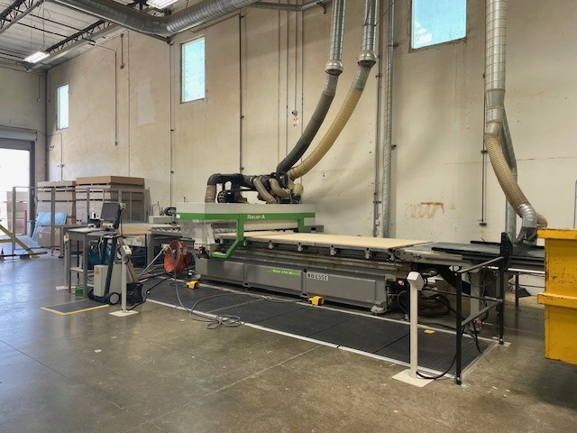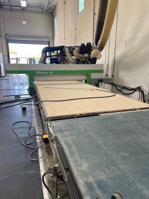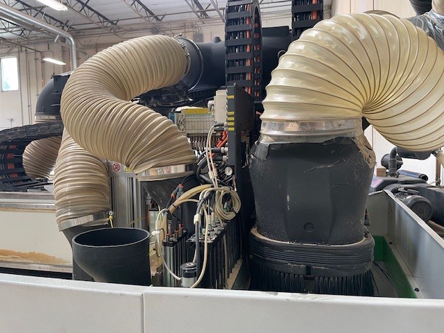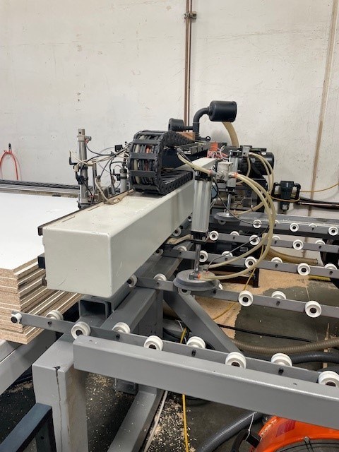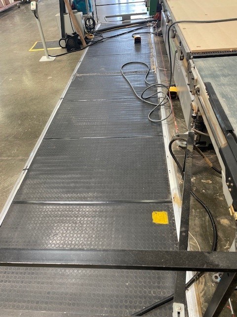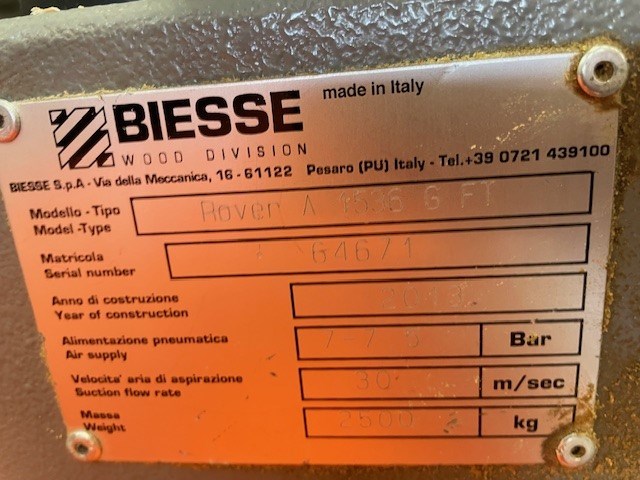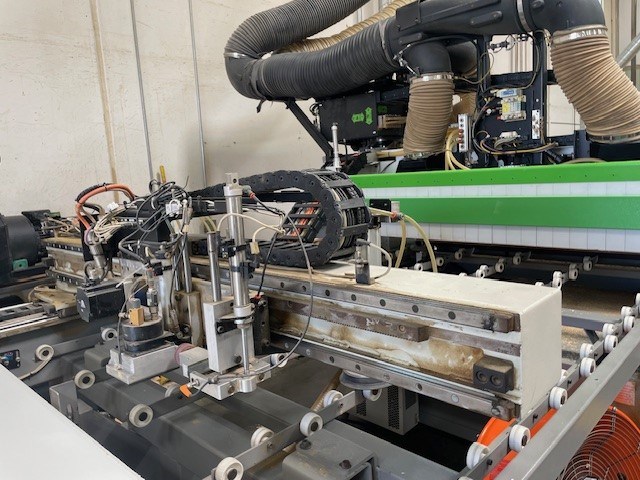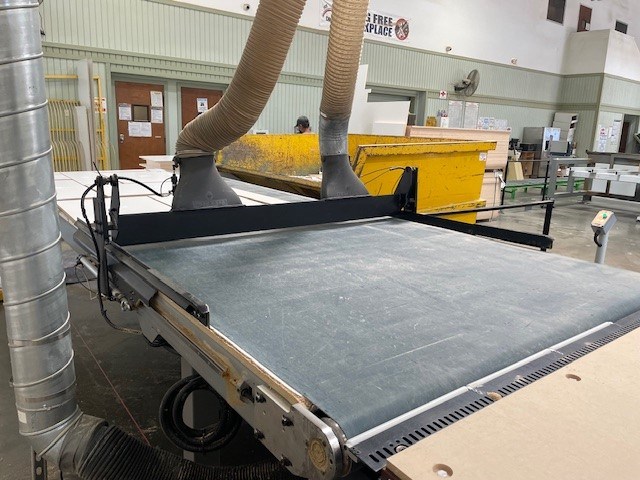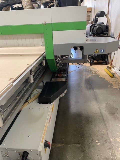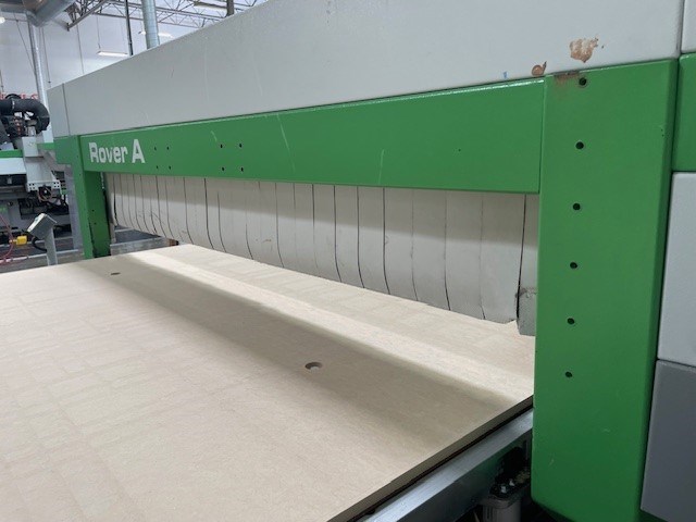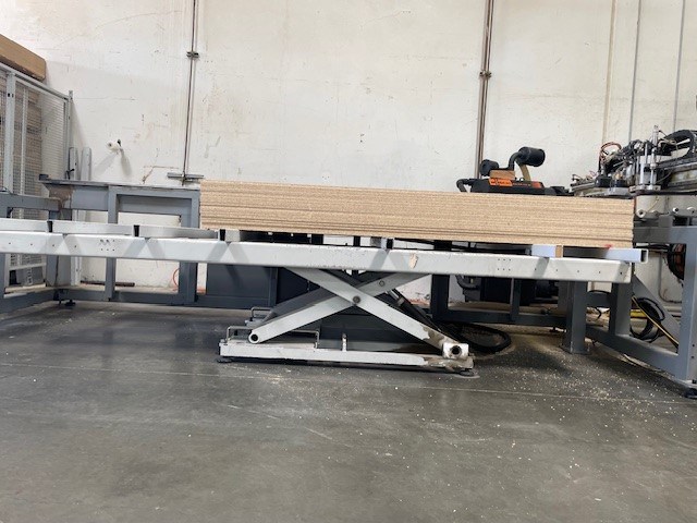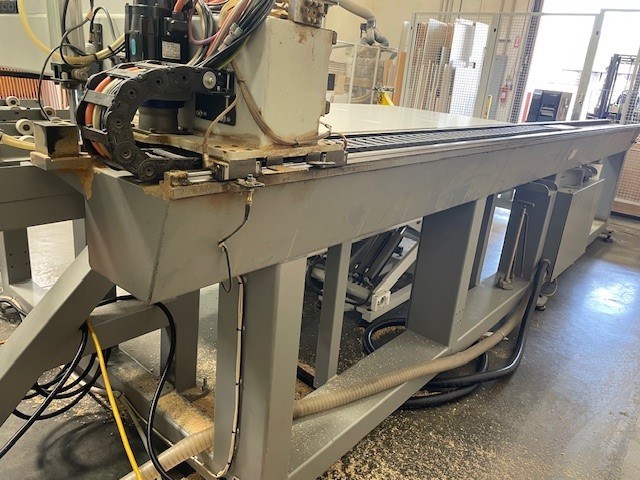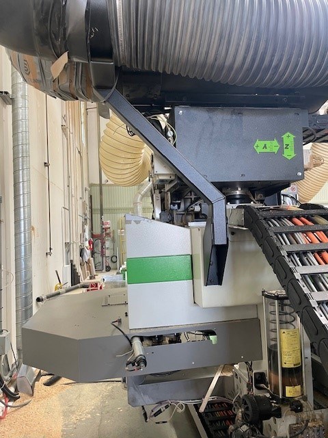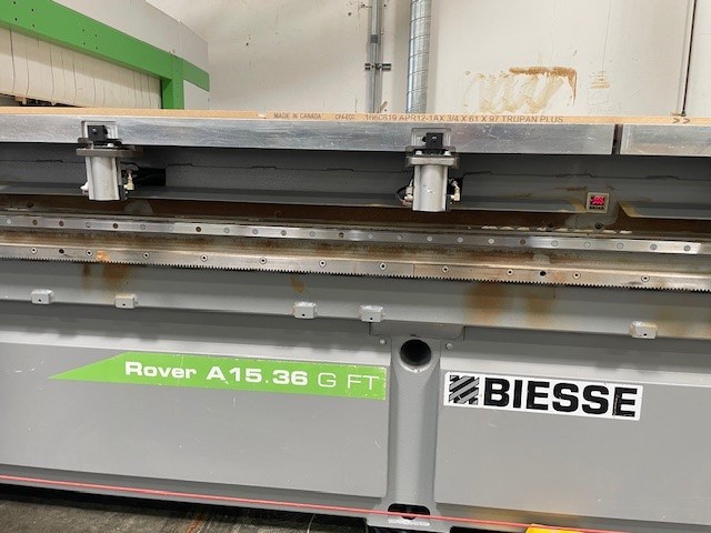 Biesse “Rover A 1536 G FT” See video of system in operation Loading System Scissor lift, 5′ x 12′ Automatic label printing system CNC 16′ L x 12′ W x 8′ H overall size 61″ x 145″ phenolic router table Pneumatic reference stops Router, 16 HP, HSK, quick-change, variable RPM Tool changer, 16 position rotary Drill unit, 27 vertical spindles, 6 horizontal spindles in x, 4 horizontal spindles in y, x axis grooving saw Sound enclosure Pneumatic dust collection gates Foot pedal control Vacuum loading device Pusher/rake unloading device with integrated dust collection Centralized lubrication system Installed tool holders and tooling Unloading System Outfeed conveyor, 61″ width, 6′ x 14′ overall Photo eye to start/stop conveyor movement Foot pedal control Bottom-mounted dust plenum on infeed and outfeed of conveyor Front safety mats Perimeter fencing Two (2) Bush “Mink MM 1322 AV” vacuum pumps, 10 HP each, 360 m/hr. capacity each 48″ L x 24″ W x 68″ overall with stand Control console PC control with standard keyboard and mouse Windows operating system External electrical transformer, 28″ L x 18″ W x 24″ H Tooling and tool holders NOT included