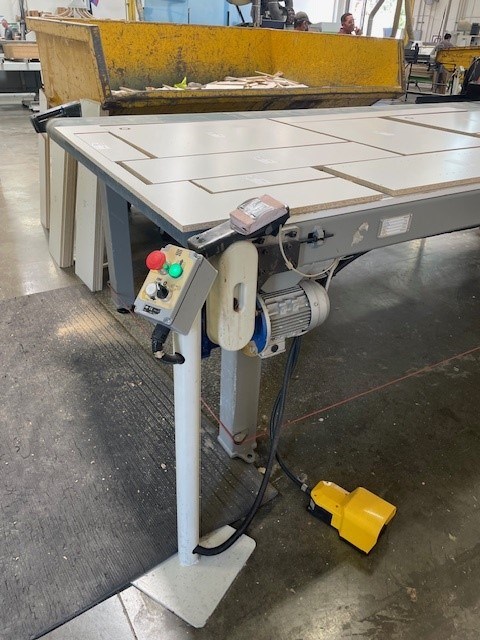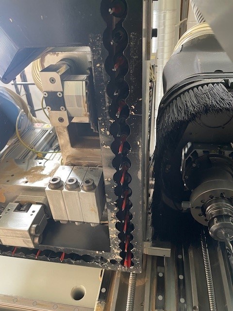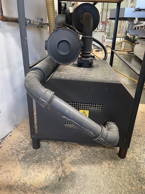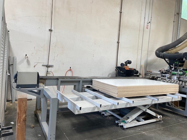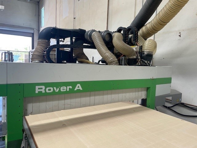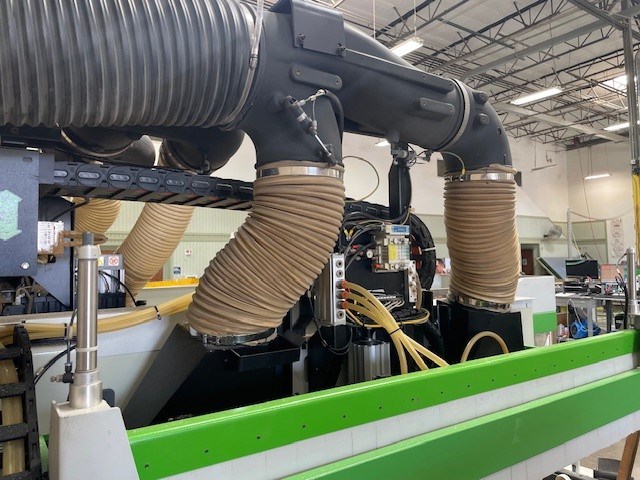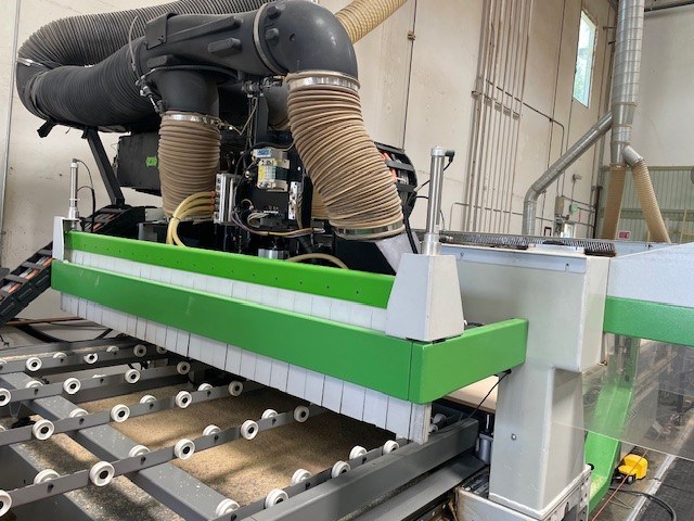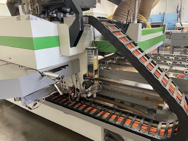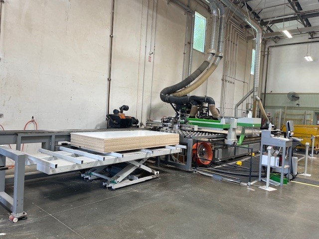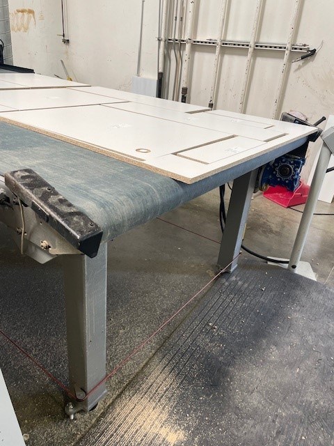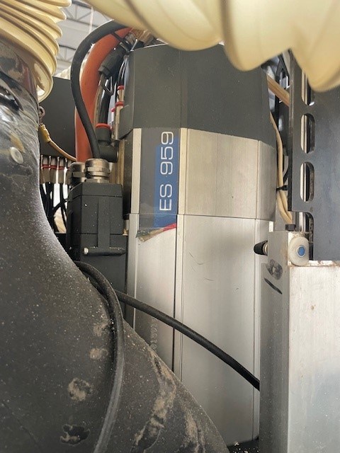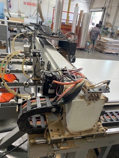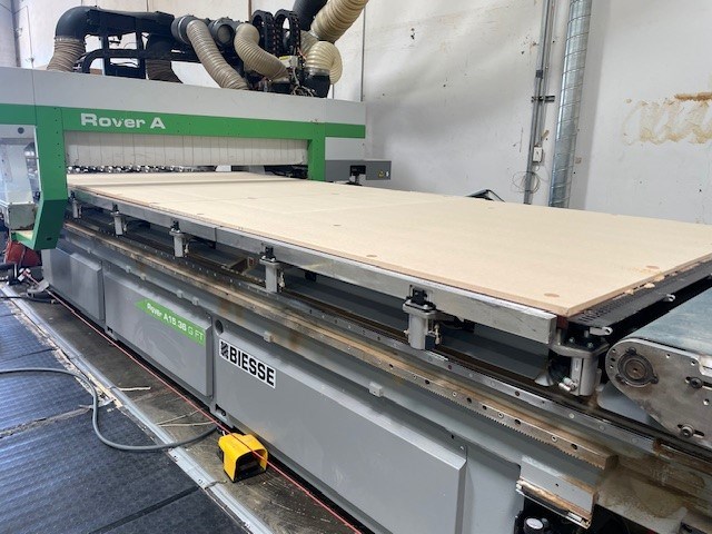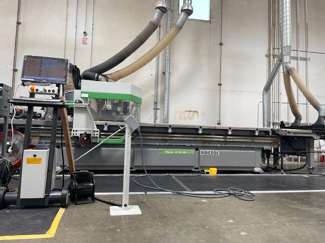 Biesse “Rover A 1536 G FT” See video of system in operation Loading System Scissor lift, 5′ x 12′ Automatic label printing system CNC 16′ L x 12′ W x 8′ H overall size 61″ x 145″ phenolic router table Pneumatic reference stops Router, 16 HP, HSK, quick-change, variable RPM Tool changer, 16 position rotary Drill unit, 27 vertical spindles, 6 horizontal spindles in x, 4 horizontal spindles in y, x axis grooving saw Sound enclosure Pneumatic dust collection gates Foot pedal control Vacuum loading device Pusher/rake unloading device with integrated dust collection Centralized lubrication system Installed tool holders and tooling Unloading System Outfeed conveyor, 61″ width, 6′ x 14′ overall Photo eye to start/stop conveyor movement Foot pedal control Bottom-mounted dust plenum on infeed and outfeed of conveyor Front safety mats Perimeter fencing Two (2) Bush “Mink MM 1322 AV” vacuum pumps, 10 HP each, 360 m/hr. capacity each 48″ L x 24″ W x 68″ overall with stand Control console PC control with standard keyboard and mouse Windows operating system External electrical transformer, 28″ L x 18″ W x 24″ H Tooling and tool holders NOT included