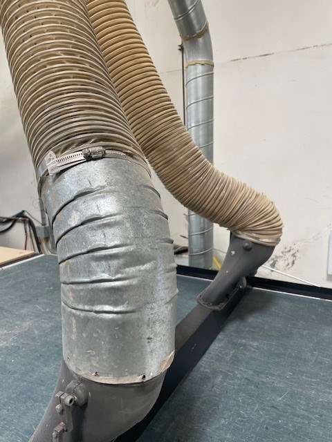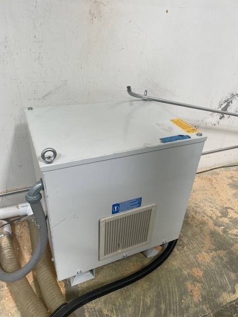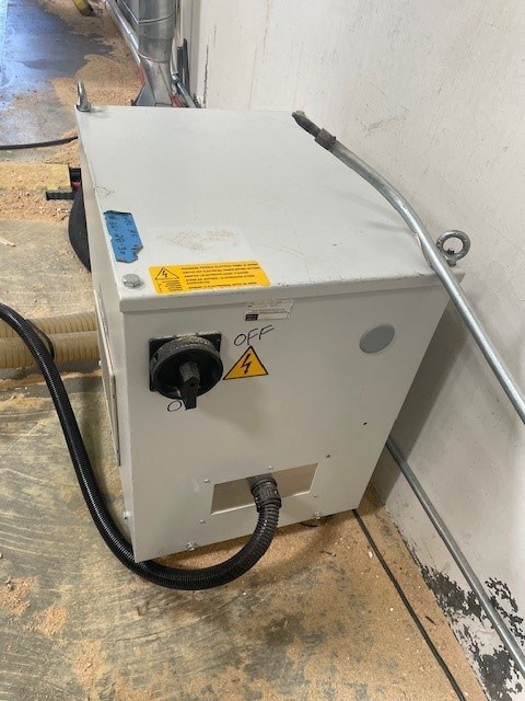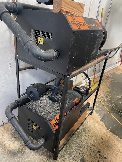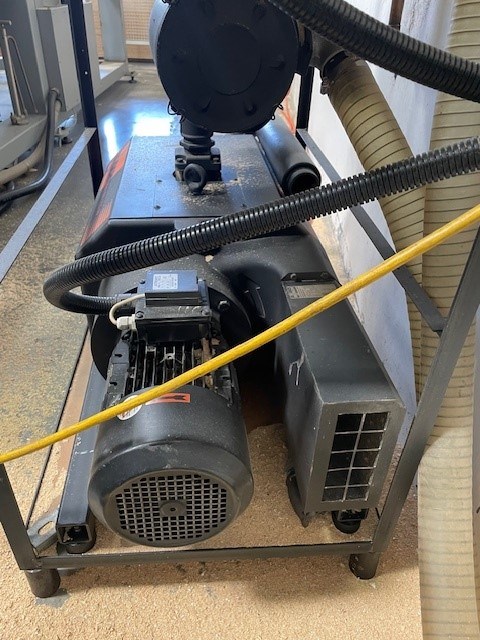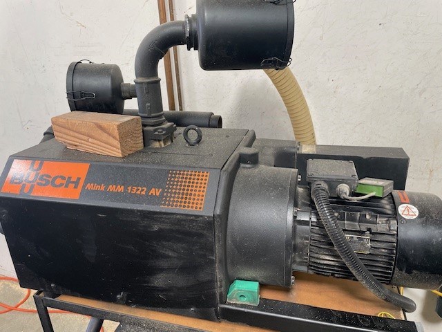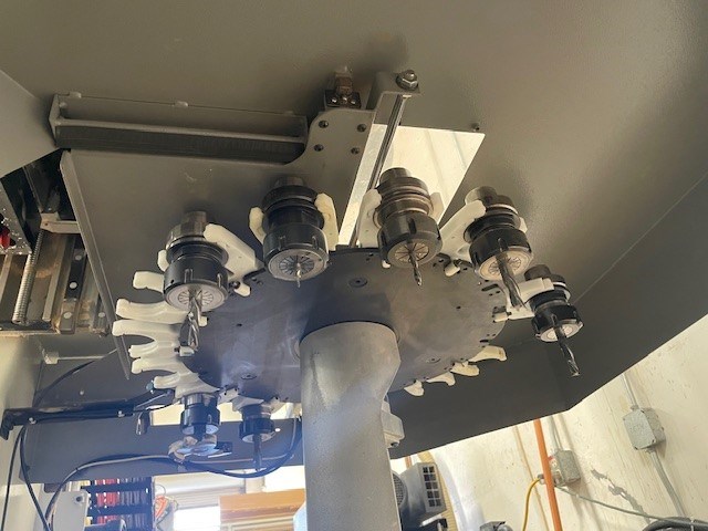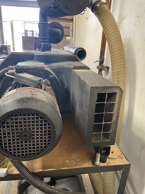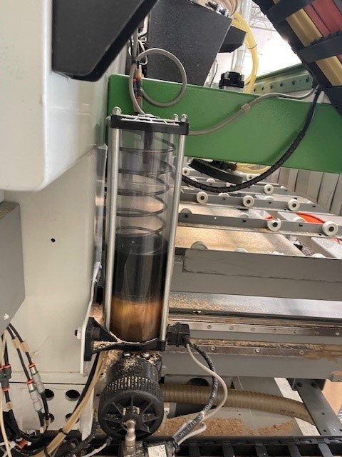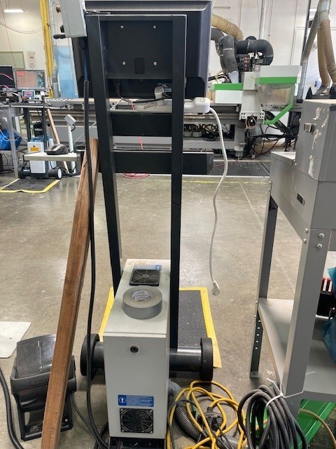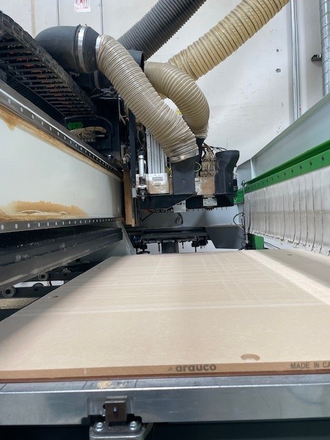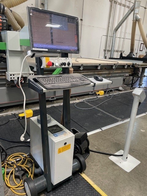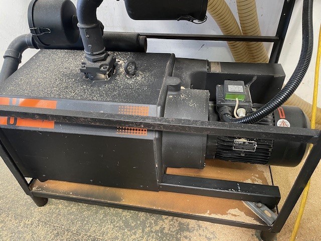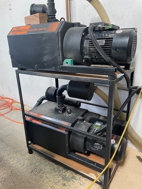Biesse “Rover A 1536 G FT” See video of system in operation Loading System Scissor lift, 5′ x 12′ Automatic label printing system CNC 16′ L x 12′ W x 8′ H overall size 61″ x 145″ phenolic router table Pneumatic reference stops Router, 16 HP, HSK, quick-change, variable RPM Tool changer, 16 position rotary Drill unit, 27 vertical spindles, 6 horizontal spindles in x, 4 horizontal spindles in y, x axis grooving saw Sound enclosure Pneumatic dust collection gates Foot pedal control Vacuum loading device Pusher/rake unloading device with integrated dust collection Centralized lubrication system Installed tool holders and tooling Unloading System Outfeed conveyor, 61″ width, 6′ x 14′ overall Photo eye to start/stop conveyor movement Foot pedal control Bottom-mounted dust plenum on infeed and outfeed of conveyor Front safety mats Perimeter fencing Two (2) Bush “Mink MM 1322 AV” vacuum pumps, 10 HP each, 360 m/hr. capacity each 48″ L x 24″ W x 68″ overall with stand Control console PC control with standard keyboard and mouse Windows operating system External electrical transformer, 28″ L x 18″ W x 24″ H Tooling and tool holders NOT included