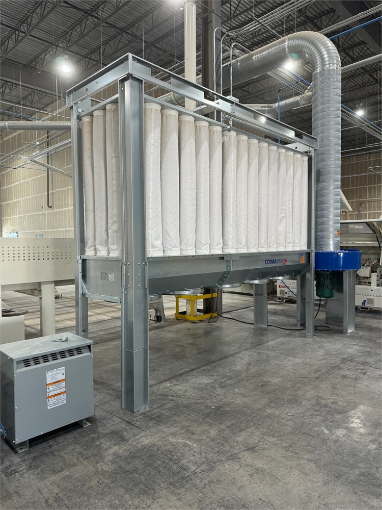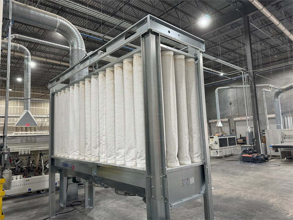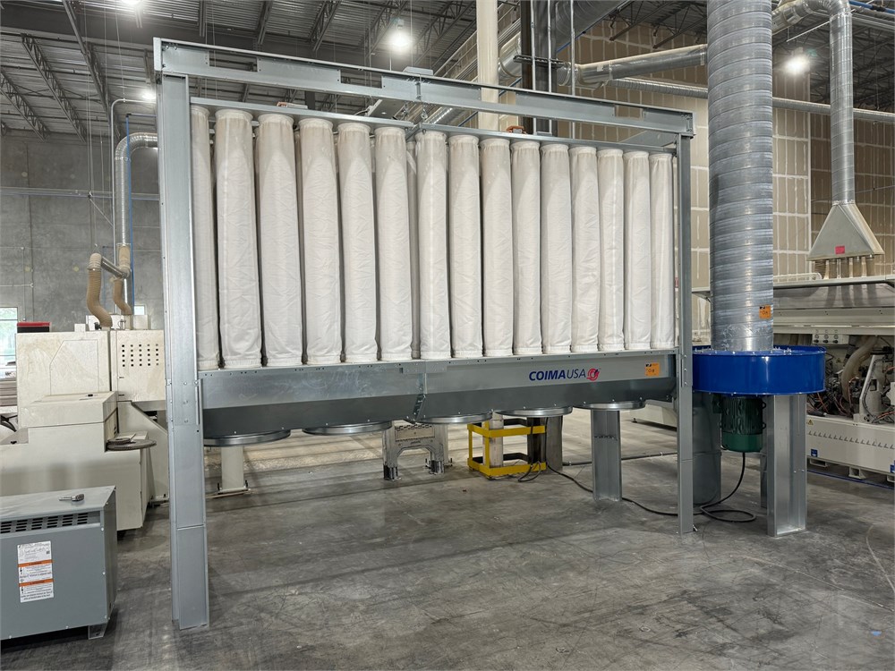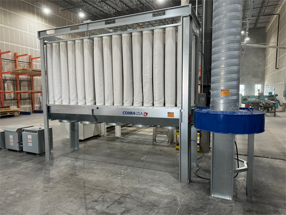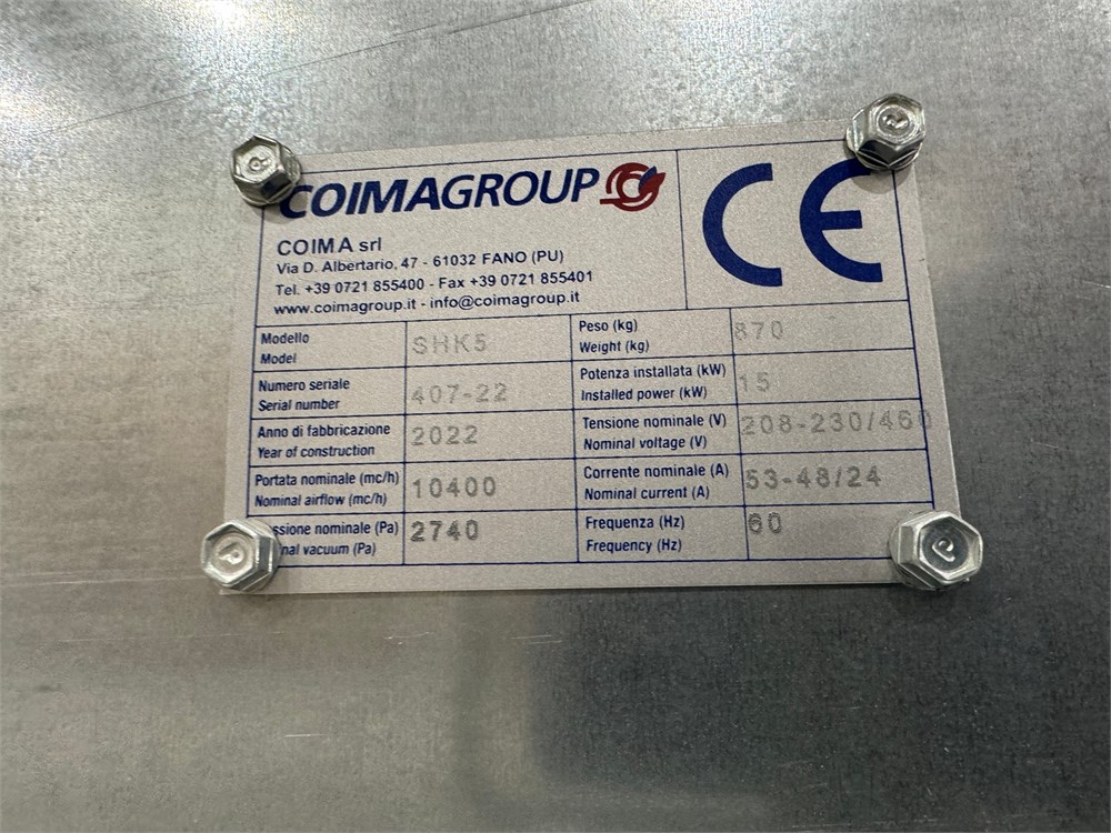 Coima “SHK5″ Dust Collector (2022) The SHK Series enclosureless dust collector is designed for the collection of sawdust and is ideal for indoor use in smaller wood shops, or for more localized extraction dedicated to specific woodworking machinery. The collector may also be used when working with other materials such as plastics, grains & flours, stone dusts and more. The integral mechanical shaker cleaning system increases production time by reducing labor required to maintain filter efficiency. The filters can be mechanically shaken after the fan is switched off (per NFPA guidelines). The filter housing supports anti-static polyester filter sleeves fixed by double snap rings into a tube sheet, which is mounted atop the material collection hopper that empties the collected material into plastic bags. The collector frame is made of durable 14 GA galvanized sheet steel. The material handling fan is rated for S1 duty cycle (continuous running), and features a premium-efficiency IP55 motor. 11” Static pressure 7,100 CFM (5) Waste bags 20 HP 595 SQ’ Filter area (60) Filters