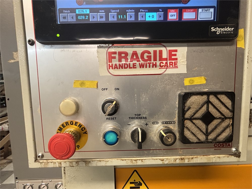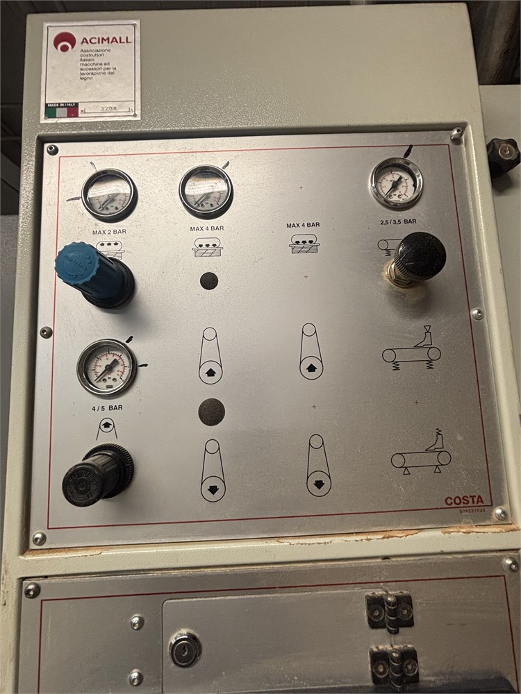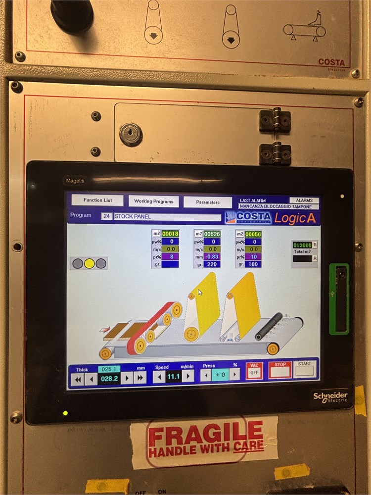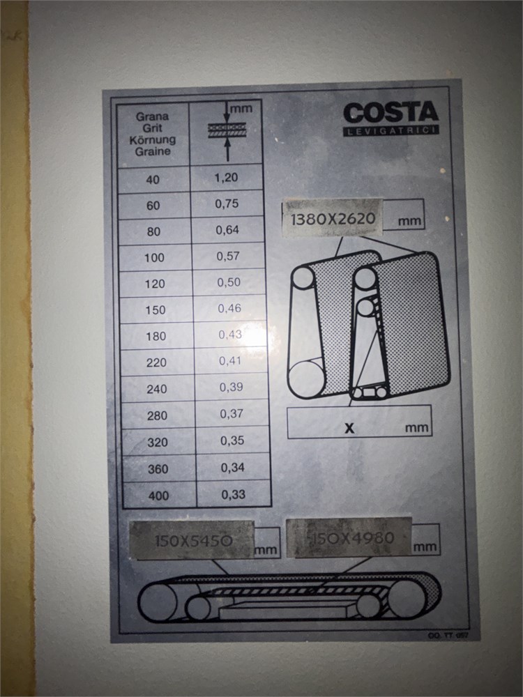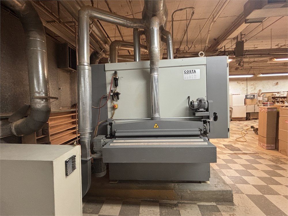 Costa “AF TRCT 1350″ 2-Head Wide Belt Sander Maximum Working Width – 53 inches (1,350 mm) First Head – Rubber‑covered calibration/contact roller -30 HP Second Head – Platen style – 24 HP Belt Size – 53” x 128″ Variable Speed – 10–50 FPM Vacuum Conveyor Bed – 7 HP Suction blower Electronic tracking Pneumatic belt tensioning Load meters Thickness readout