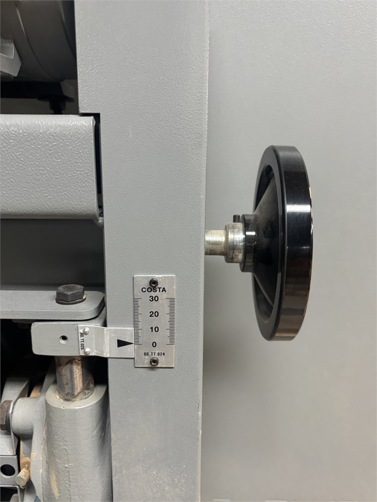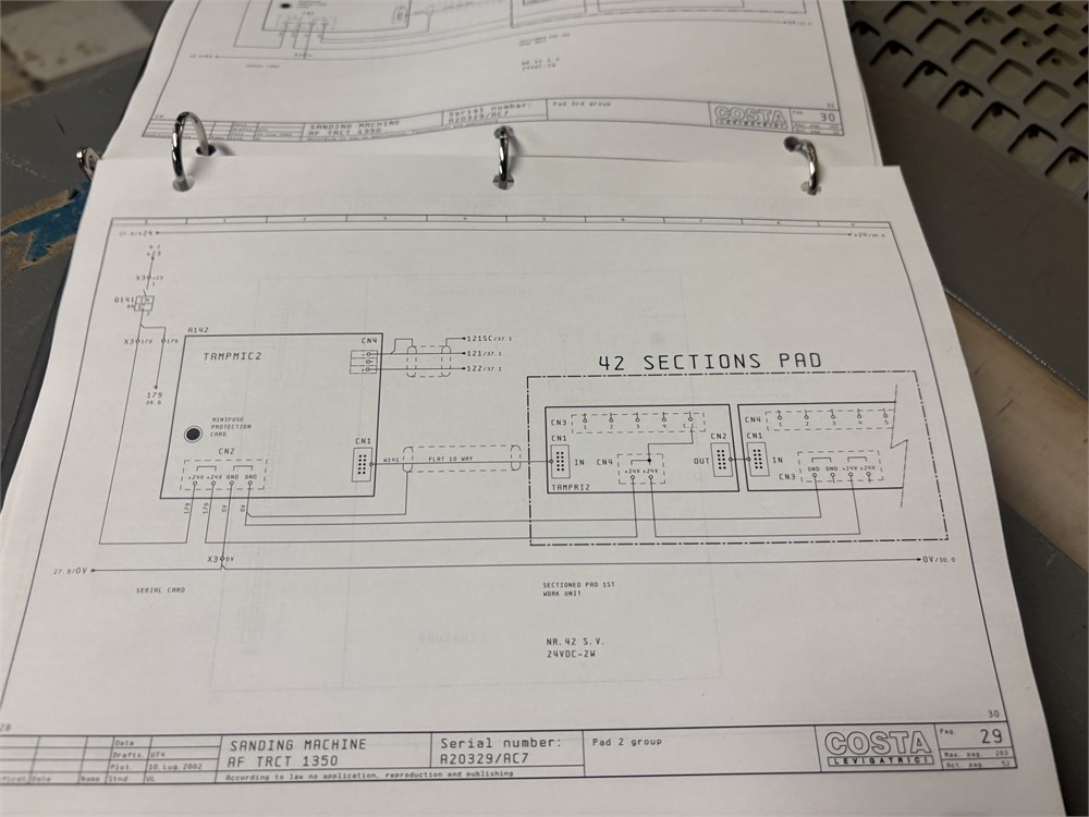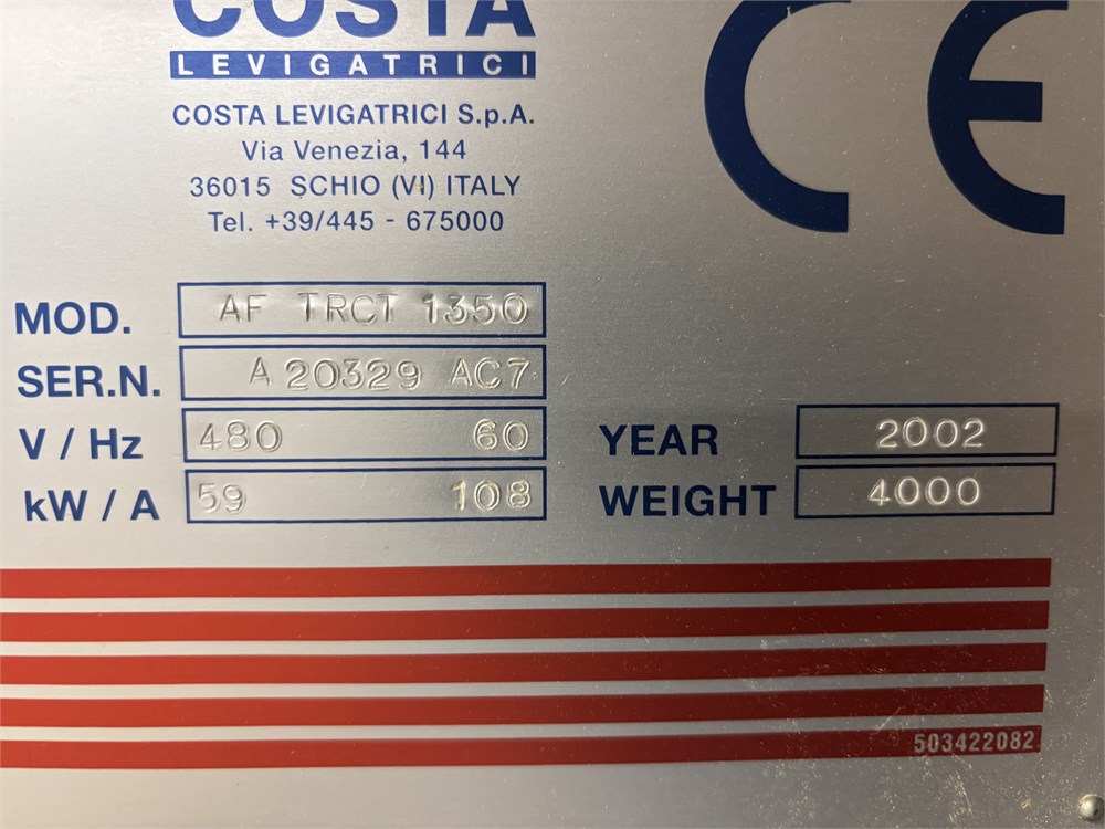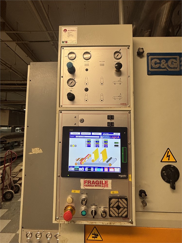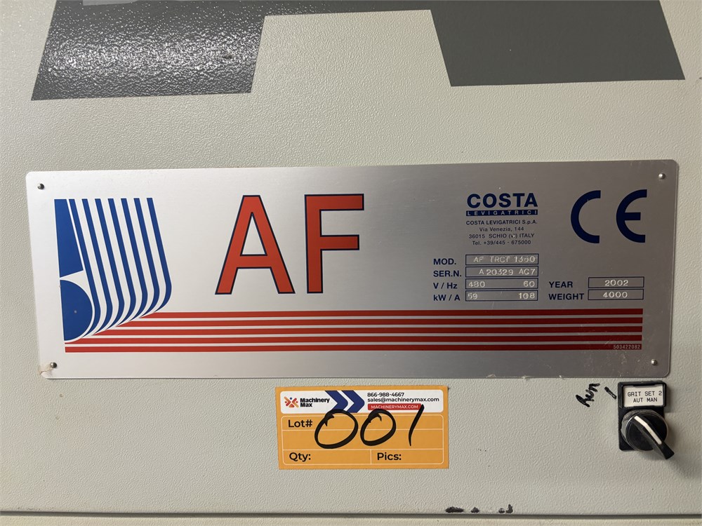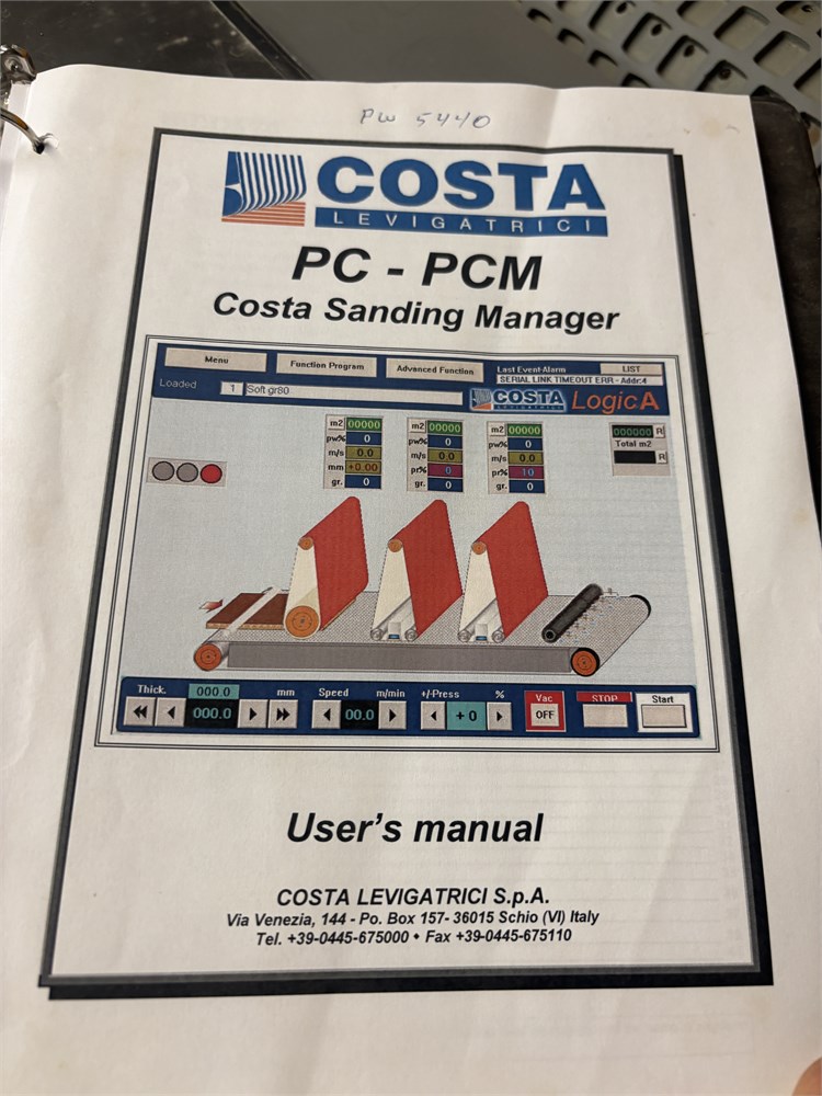 Costa “AF TRCT 1350″ 2-Head Wide Belt Sander Maximum Working Width – 53 inches (1,350 mm) First Head – Rubber‑covered calibration/contact roller -30 HP Second Head – Platen style – 24 HP Belt Size – 53” x 128″ Variable Speed – 10–50 FPM Vacuum Conveyor Bed – 7 HP Suction blower Electronic tracking Pneumatic belt tensioning Load meters Thickness readout
