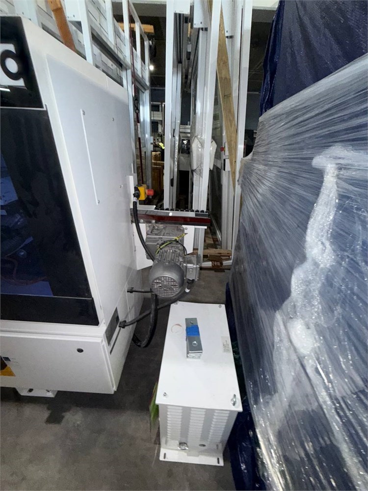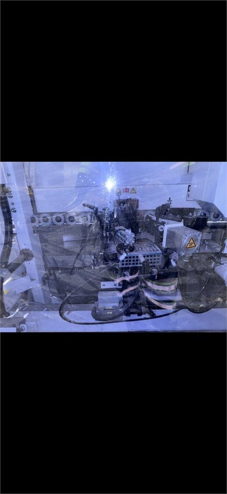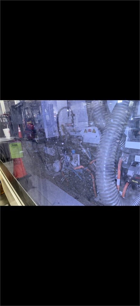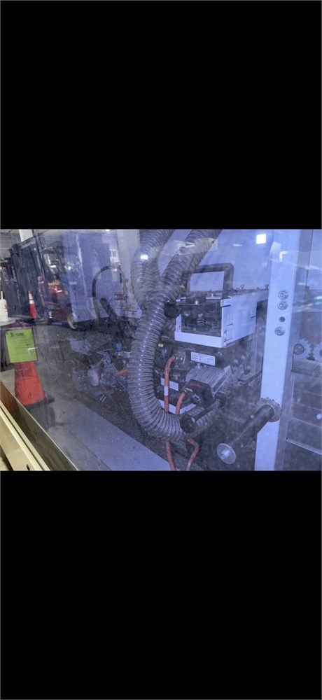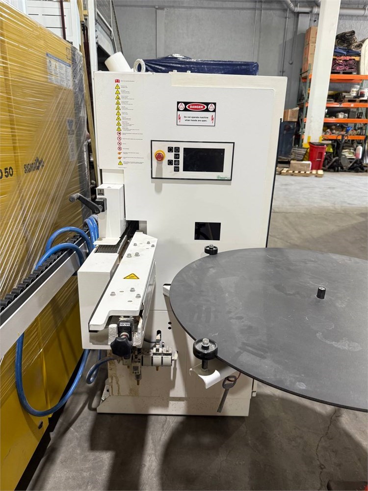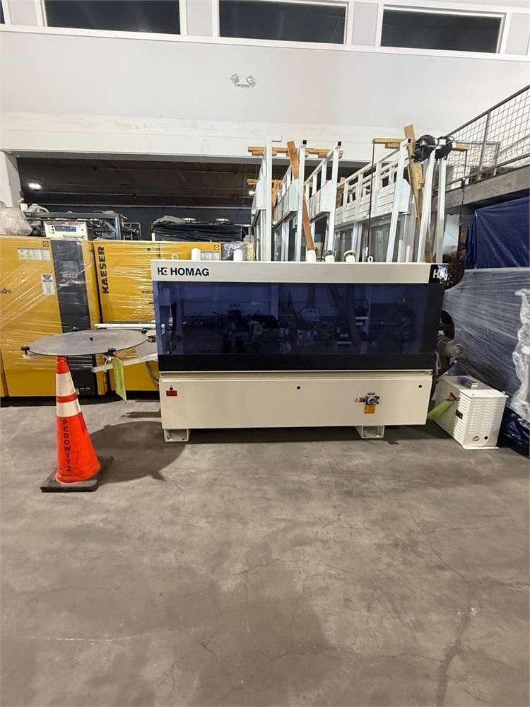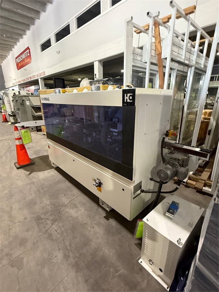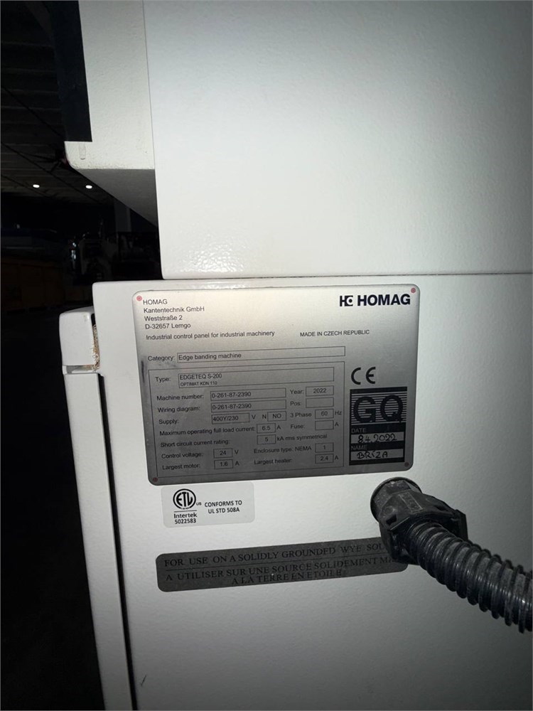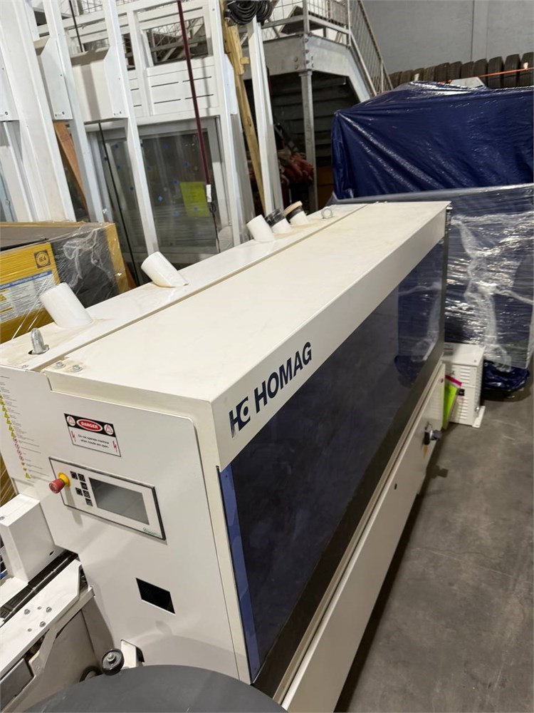 2022 Homag “Edgeteq S-200″ Edgebander 140 mm (5.5″) minimum part length 70 mm (2.75″) minimum panel width (thickness less than 23 mm) 120 mm (4.75″) minimum panel width (thickness greater than 23 mm) 8 mm (5/16″) – 40 mm (1.5″) panel thickness 0.4 mm – 3 mm coiled or strip edgebanding thickness 26 FPM feed speed Touch screen controller Easy/Touch program control 7″ display 20 program storage Machine and production data Automatic height adjustment of top pressure beam Edgebanding infeed table, 32″ diameter Guillotine Glue unit with glue pot and roller Pressure zone One (1) driven roller Two (2) idle rollers Two (2) motor end trimming unit, 0.25 HP motors operating @ 12,000 RPM Top/bottom fine trimming unit, 0.36 HP motors operating @ 12,000 RPM Three (3) work positions: flush trimming, trimming with overhang, radius/bevel trimming Open space – possibility of adding profile scraping unit (call manufacturer for more information) Top/bottom buffing unit Sound enclosure Outboard roller support External electrical transformer