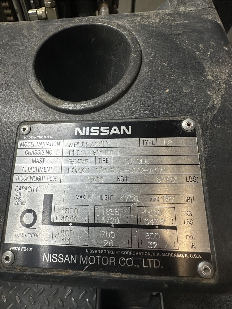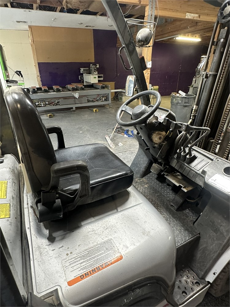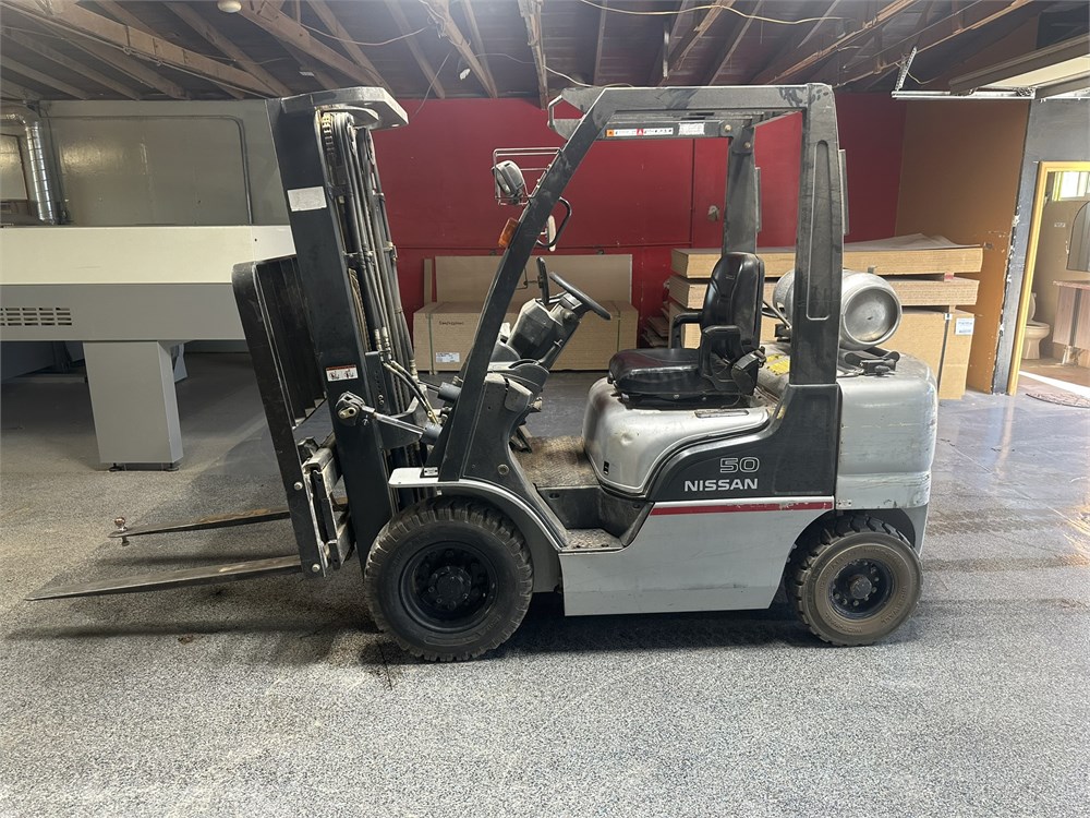 Nissan “50” Forklift LPG 4,400 pound lifting capacity 187″ max lift height 5″ x 42″ forks Side shift 1,720+ hours (still in use)