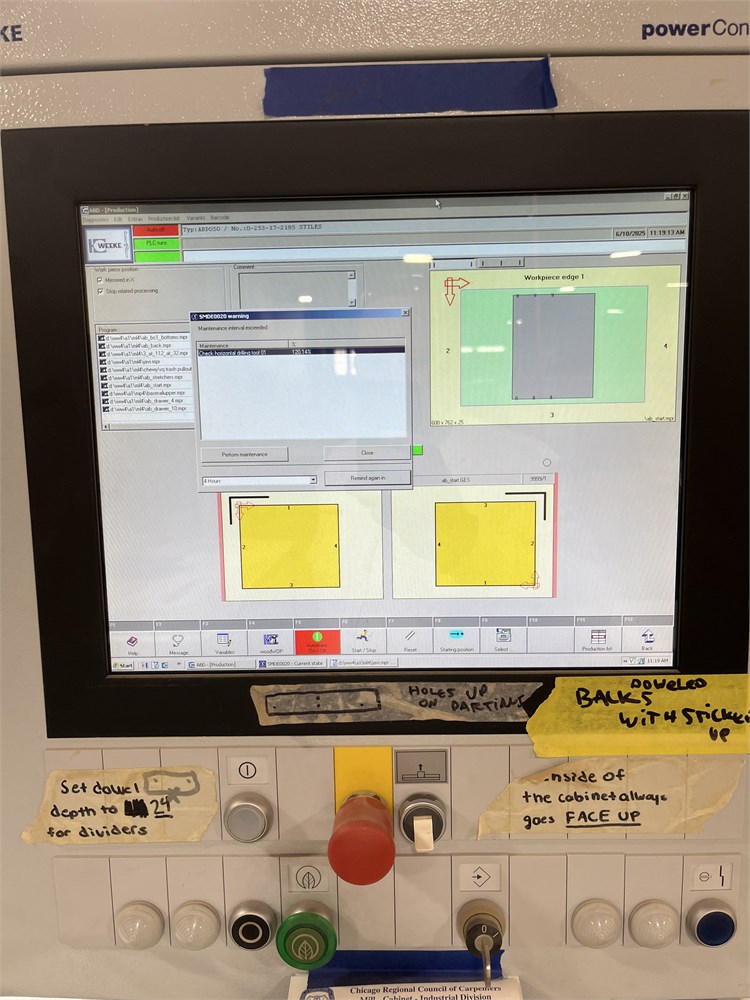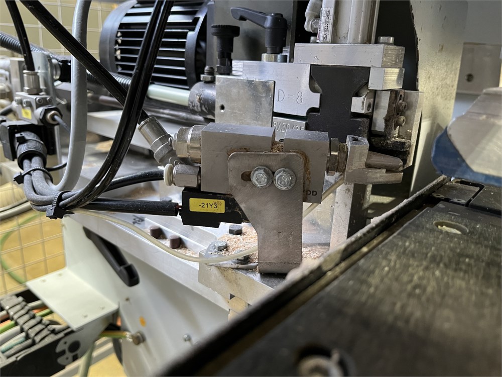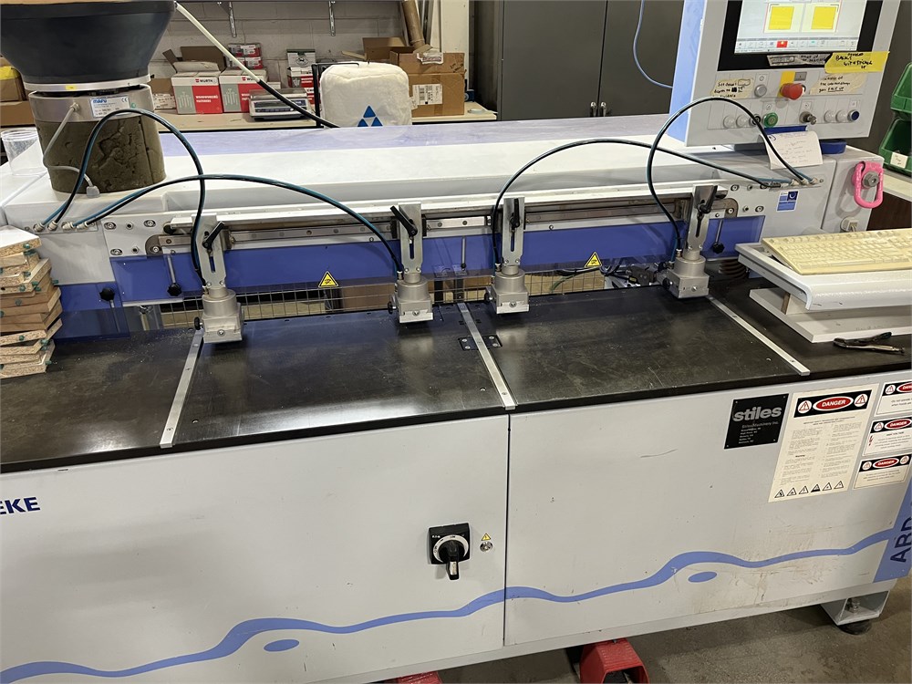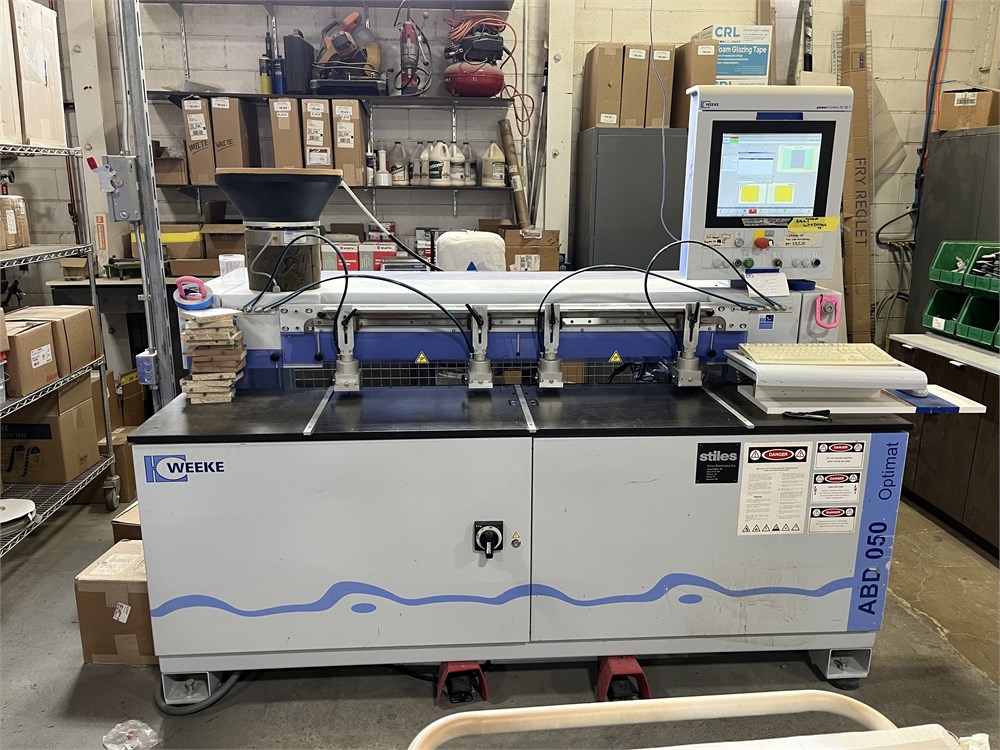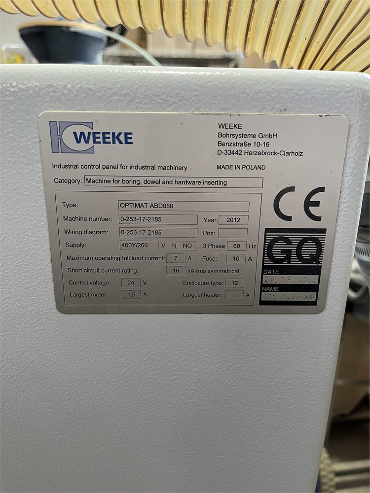Weeke “ABD-050″ CNC Bore and Dowel Machine See PDF of machine quote (for reference only, not all options necessarily apply) CNC Dowel Inserter for horizontal drilling and dowel inserting Engineered to spray glue or water Four (4) work fields Left, center and right fences Open end table for machining longer parts One (1) horizontal drill One (1) dowel inserter Dowel hopper Four (4) pneumatic clamps Glue tank and pump PC control (Power Control PC 85 T) Standard keyboard and mouse Windows operating system Maximum part length, 1250 mm/49″ Minimum part length, 20 mm/0.8″ Maximum part width, 800 mm/31.5″ Minimum part width, 50 mm/2″ Maximum part thickness, 60 mm/2.4″ Minimum part thickness, 10 mm/0.4” Maximum part length for center stop, 600 mm/23.5″